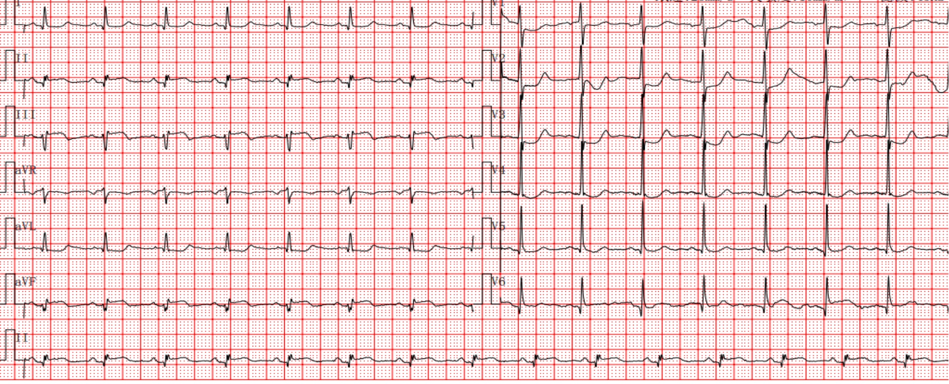 虽然晕厥在急性心肌梗死中并不常见,但它却是心源性猝死的重要预警信号。其发生机制通常与一过性恶性心律失常或急性泵衰竭引起的循环崩溃相关。本病例初步诊断于神经内科,在排除脑血管事件后,迅速转至心电图筛查,发现急性下后壁ST段抬高。ST段抬高也可能出现在颅内出血等非心源性疾病中,但结合患者心肌酶谱的显著升高,可以明确诊断为急性心肌梗死[1]。这种不典型的发病方式在临床上构成了显著的诊断陷阱,尤其对于伴有高血压、高龄等危险因素的晕厥患者,急性冠脉综合征应当被优先考虑在鉴别诊断中,及时完善心电图、心肌损伤标记物等相关检查[2]。