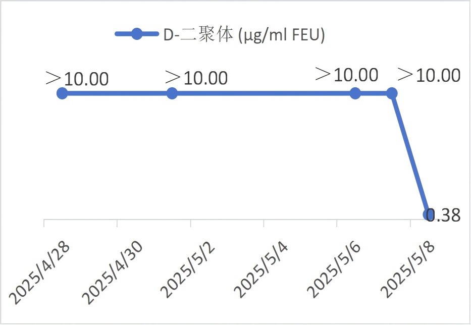 随着治疗推进,患者心包积液逐渐吸收,血流动力学趋于稳定,但阵发性心房颤动及新发双下肢静脉血栓促使抗凝治疗。2025-05-06,复查心包积液已进一步吸收至少量,BNP降至1262.38 ng/L,C反应蛋白恢复正常。权衡血栓与出血风险后,遂开始给予依诺肝素0.2 ml (约20 mg)皮下注射每日一次进行试探性抗凝。次日(5月7日),复查床旁超声确认心包积液未增多,D-二聚体仍 > 10.00 μg/ml FEU,遂将依诺肝素剂量增加至0.4 ml (约40 mg)每日一次以增强抗凝效果。至2025-05-08,复查凝血功能(PT 11.3 s, APTT 28.0 s)均在正常范围,血红蛋白稳定(123 g/L),心包积液基本吸收、未进展。鉴于患者冠心病诊断明确,为预防支架内血栓及冠状动脉事件,于当日加用氯吡格雷片75 mg每日一次,与低分子肝素形成短期抗栓方案。