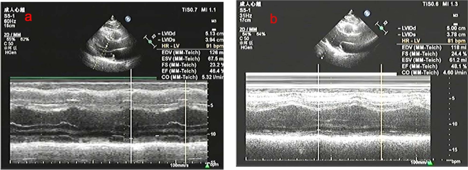 注:(a) 出院后2个月后复查心脏彩超:EF:46%,阶段性室壁运动异常,左室心尖部室壁瘤形成可考虑,主动脉瓣反流(少量),二尖瓣反流(少量),三尖瓣反流(少量),左室扩大,左心功能减退。(b) 出院后4个月后复查心脏彩超:EF:48%,节段性室壁运动异常(多节段)、左室心尖部室壁瘤形成可考虑、主动脉瓣反流(少量)、左室扩大、左心功能减低。