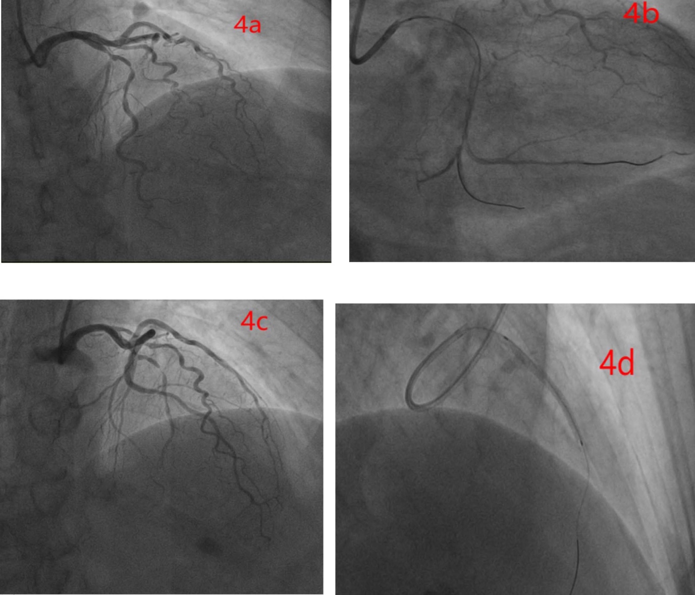 注:(4a) 为出院后2个月行冠脉造影治疗,(4b) 为放置支架术后。(4c) 为出院后4个月行冠脉造影治疗,(4d) 为放置支架术后。