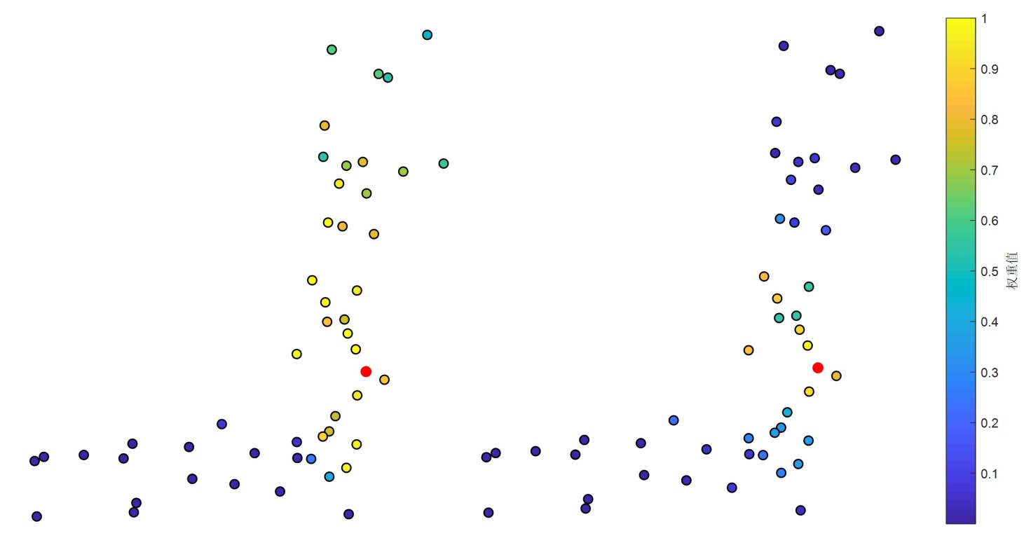 第三步:赋权拟合。通过法向集差异对邻域中的每个邻域点赋权,并利用加权最小二乘拟合得到最终的法向