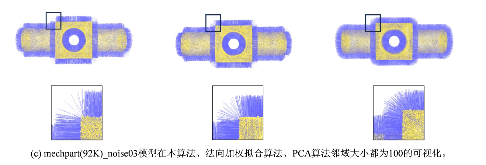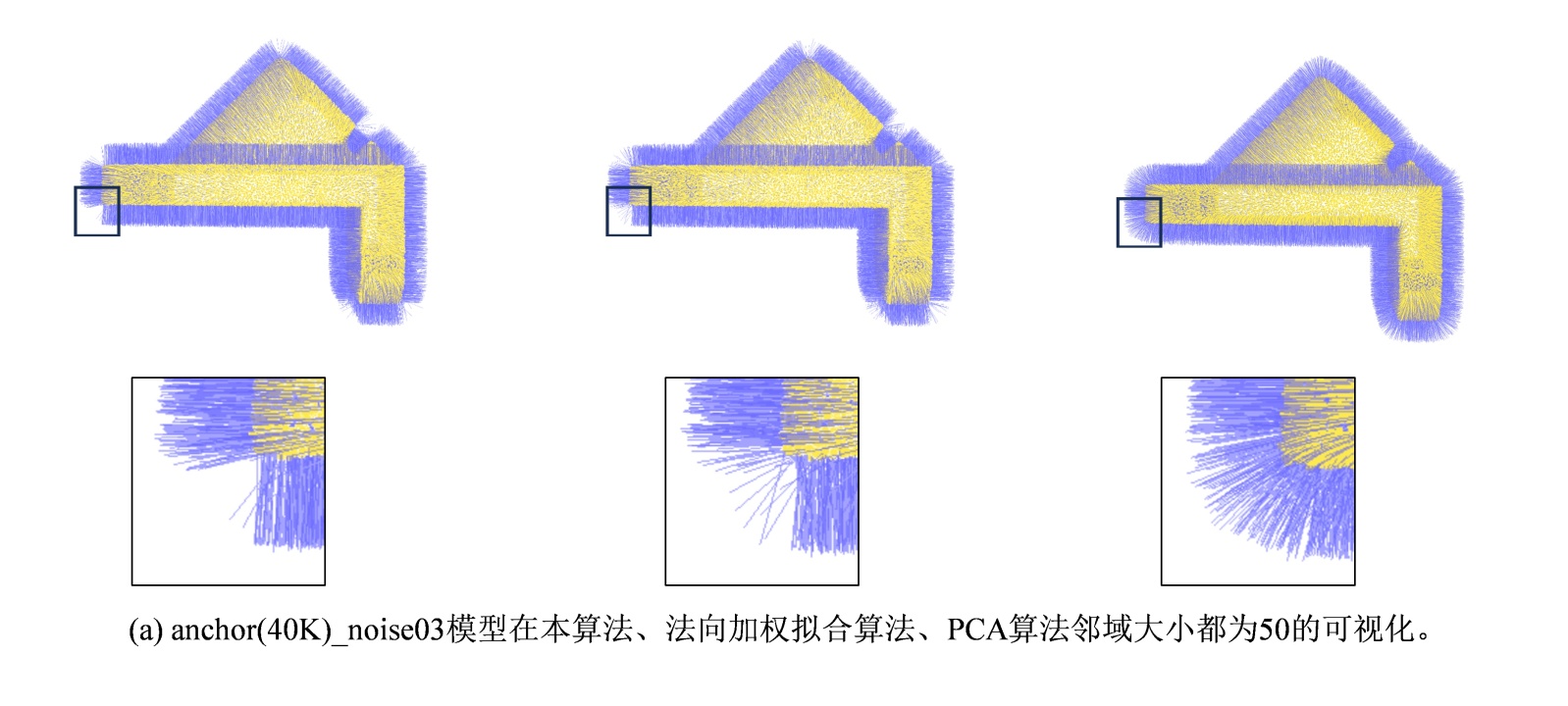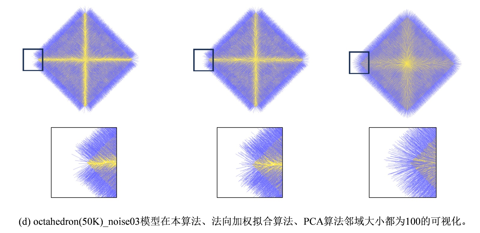 图5. 本算法、法向加权拟合算法、PCA算法在不同模型下的可视化