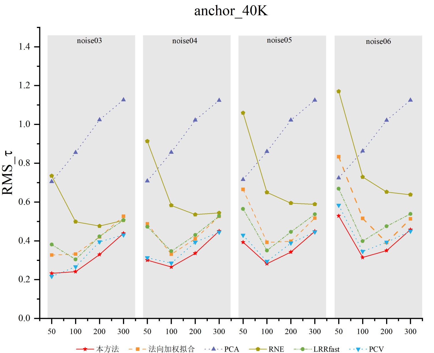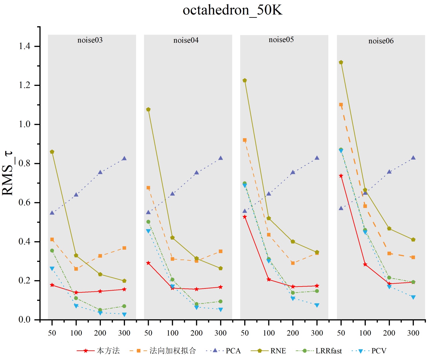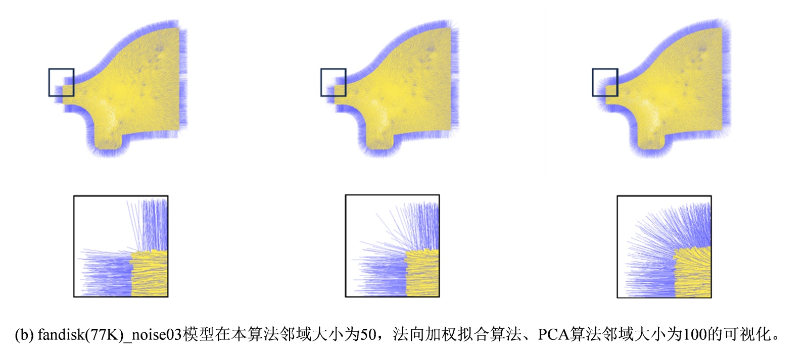 图5. 本算法、法向加权拟合算法、PCA算法在不同模型下的可视化