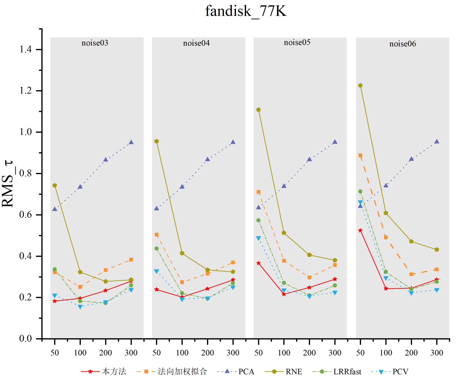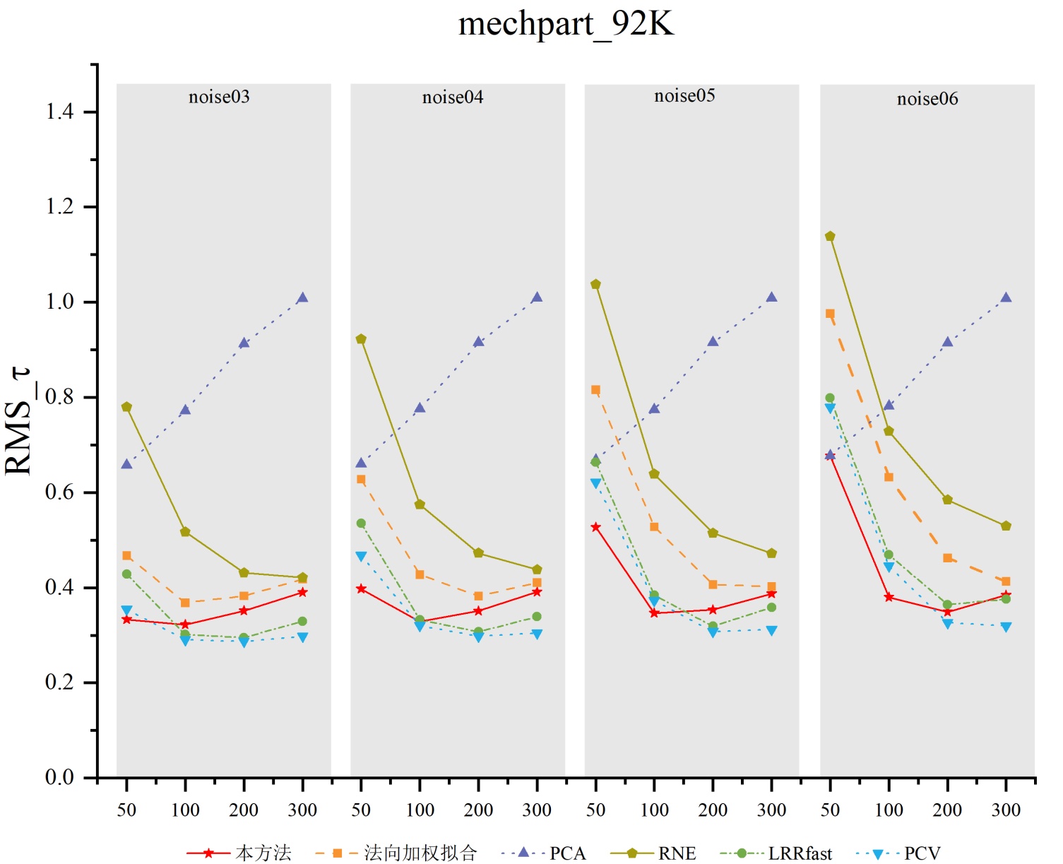 如图5可视化结果所示,在噪声的影响下,PCA算法仍然可以准确地估计出光滑曲面的法向,但是在模型的尖锐特征处估计出的法向准确性较低。这是由于在尖锐特征处,特征点的邻域点可能采样自多个光滑曲面,所以PCA算法选择整个邻域进行平面拟合时,易受采样自其他光滑曲面的点影响,导致估计出的法向过于光滑,误差较大。这样,法向加权拟合算法利用PCA算法估计的单一的、不准确的初始法向来加权拟合,在尖锐特征处得到的法向估计结果不够准确。而本算法在不同噪声环境下均能有效抑制跨曲面干扰,保持了尖锐区域的几何特征,与法向加权拟合算法相比,本算法提高了在尖锐特征处的法向估计的准确性。