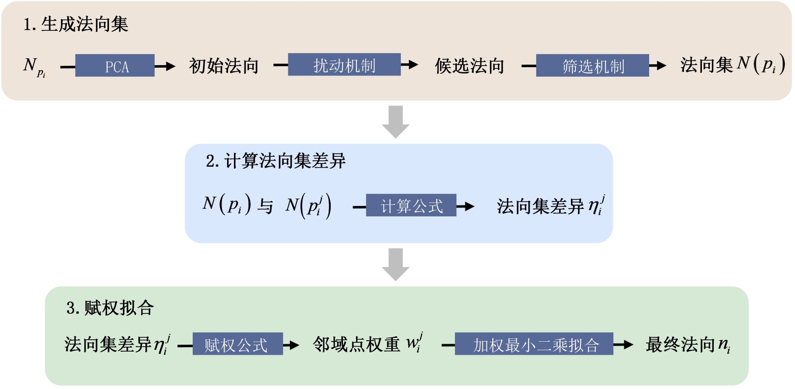 。本文提出的基于法向集差异的点云法向估计算法包括“生成法向集–计算法向集差异–赋权拟合”三个过程。