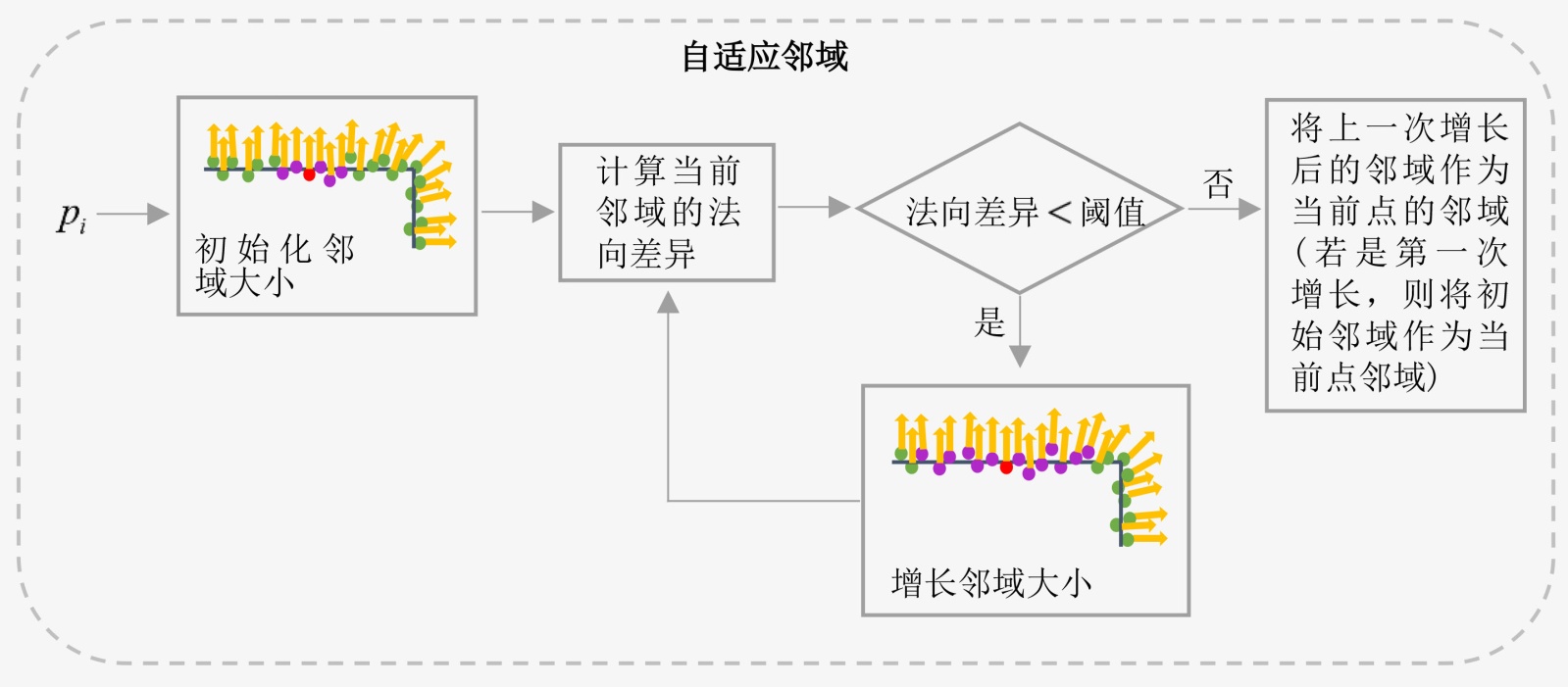 设置为一个较小的值。自适应邻域算法的核心步骤是逐步增长邻域大小,所以增长邻域的过程何时终止是一个关键问题。本文给出一种评价方式,首先计算当前邻域内法向的角度差异