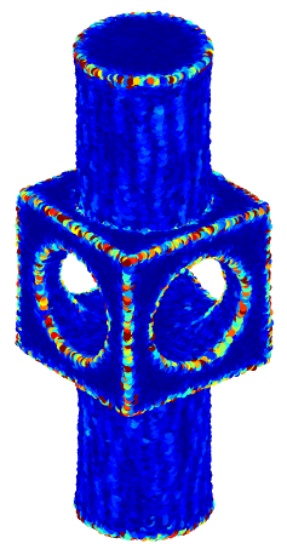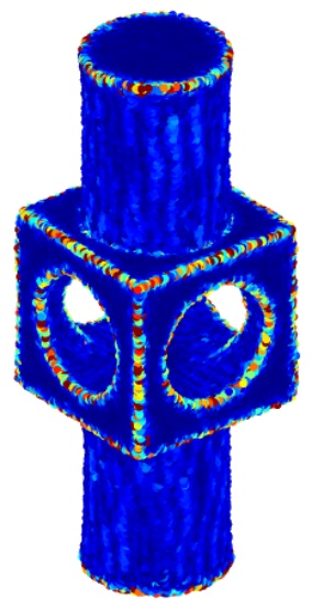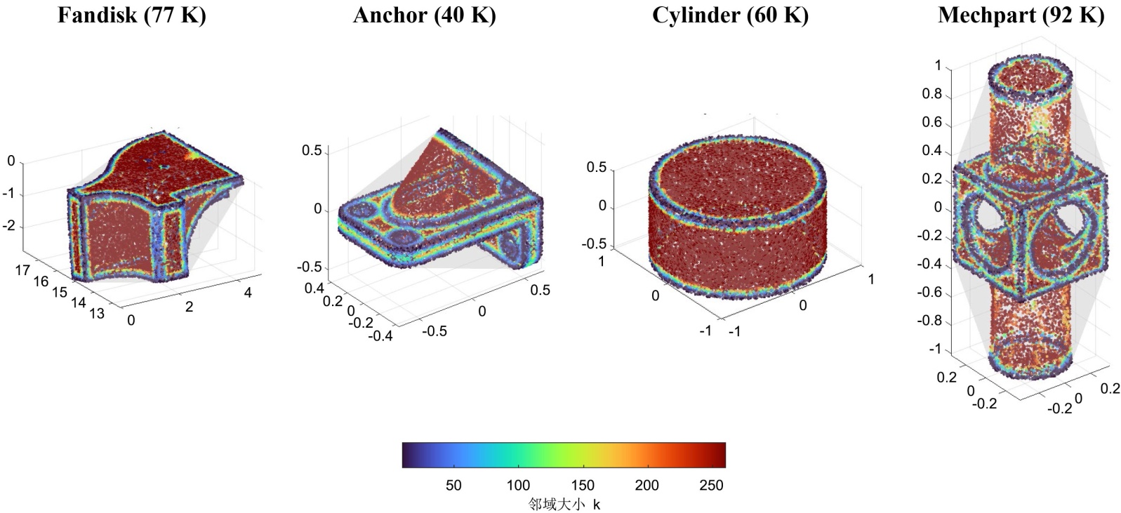 本文绘制了两种噪声水平下四个模型的自适应邻域热力图,如图3所示。Fandisk (77 K)和Anchor (40 K)的噪声水平为30%,Cylinder (60 K)和Mechpart (92 K)的噪声水平为50%。热力图的绘制采用按比例抽样的方式。若点云数量超过2万,按比例20%抽样(如10万点抽20%即2万点),确保抽样均匀覆盖整个点云,并且抽样绘制能够保证可视化的效果。由图3可以明显看出,自适应邻域算法能够根据点的几何特性自适应地调整邻域大小。不同颜色代表自适应邻域的大小不同,点在尖锐特征处或尖锐特征附近,自适应邻域较小,呈现深蓝色;点在平坦区域,自适应邻域较大,呈现红色。