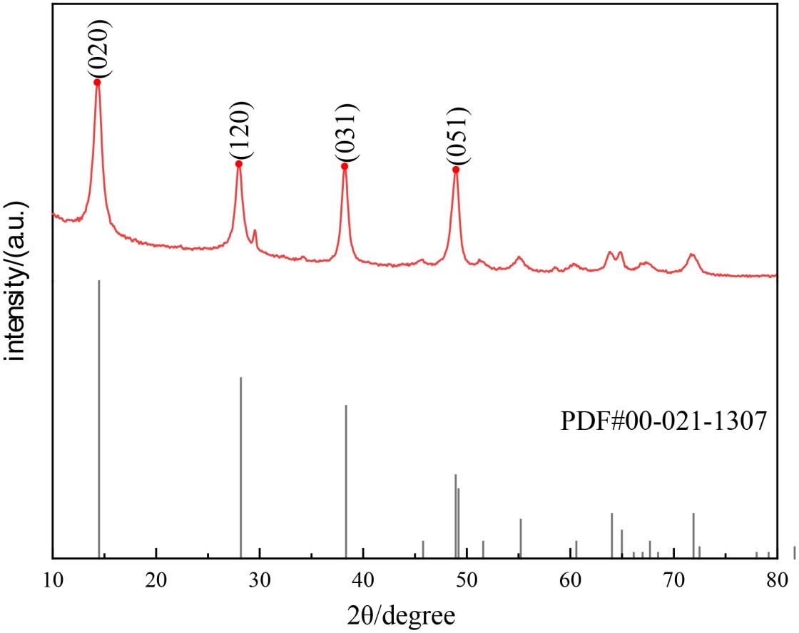 AlOOH是由AlO6八面体层状组成,层间由氢键连接,勃姆石的晶体结构使得其生长不易沿着[010]晶向进行[18]。原料中的NO-会优先选择附着在(010)与(001)晶面,从而阻碍了晶体沿着[010]和[001]晶向生长,故而最终AlOOH的形貌呈现为叶片状[19]。