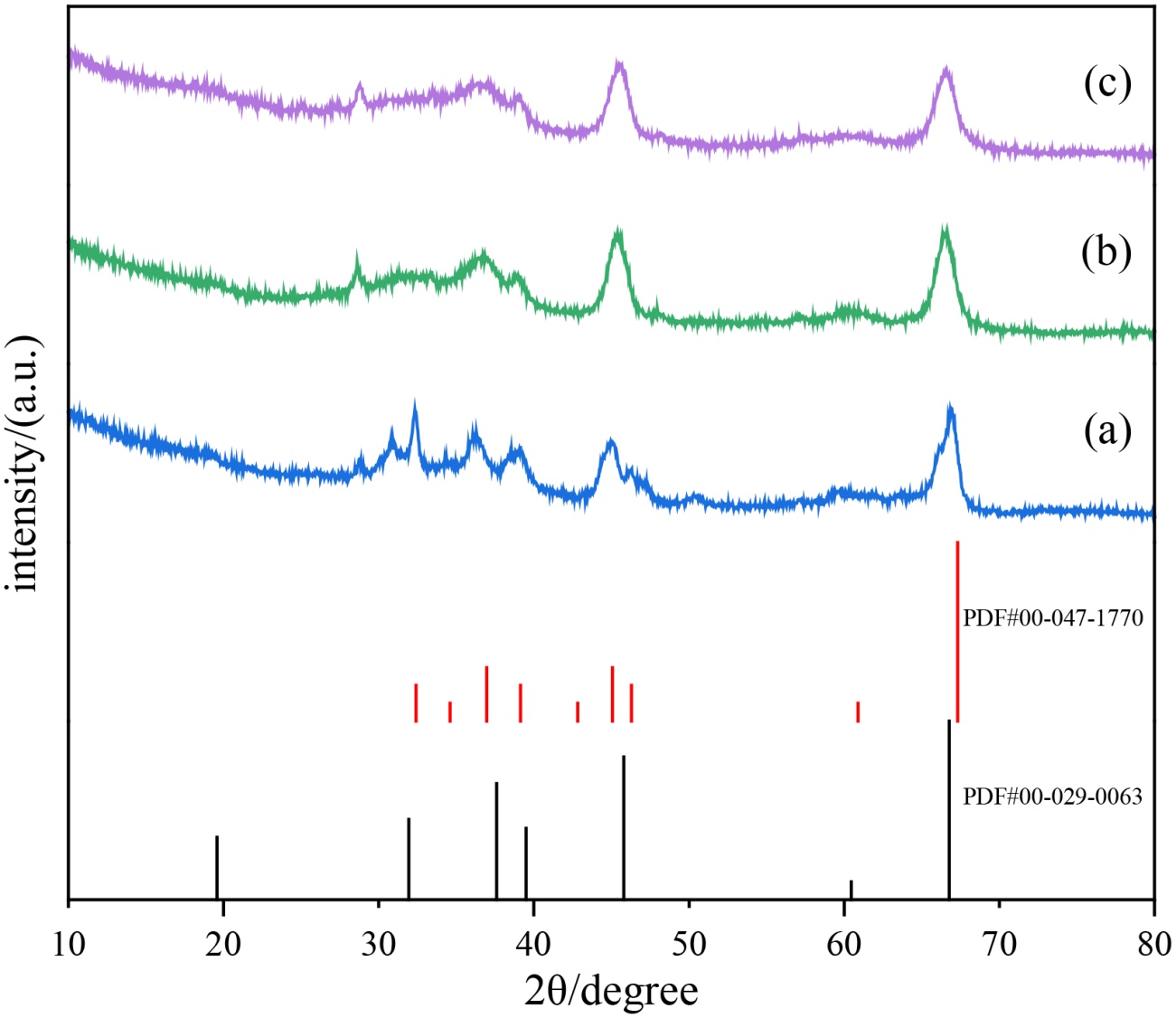 图4. 不同焙烧温度下合成产物的XRD图谱:(a) T = 600˚C; (b) T = 800˚C; (c) T = 1000˚C