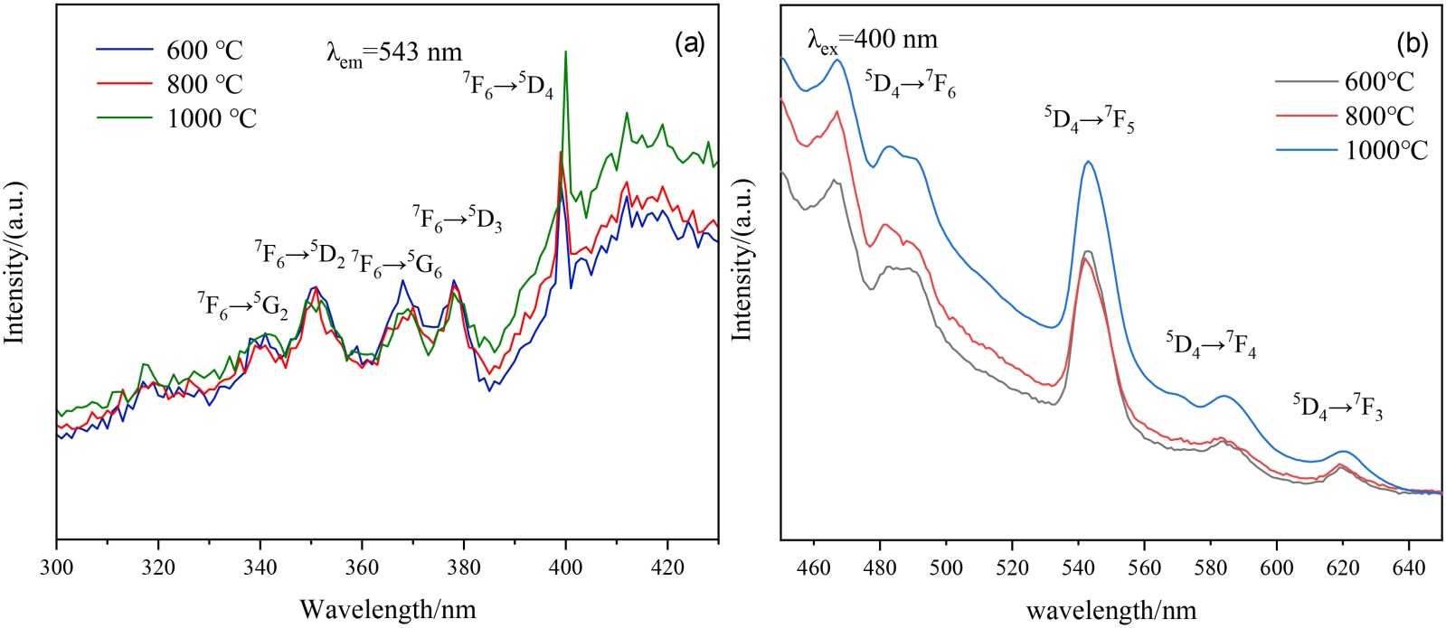图6(a)为Al2O3:Tb3+在543 nm的监测波长测得的激发光谱图谱。由图可见,最强激发峰位于400 nm附近,对应于Tb3+的7F6→5D4跃迁,且随着煅烧温度的升高,该激发峰的强度逐渐增加。此外,还出现多条位于342 nm、352 nm、368 nm、378 nm的激发峰,分别对应于Tb3+离子的7F6→5G2、7F6→5D2、7F6→5G6、7F6→5D3跃迁。