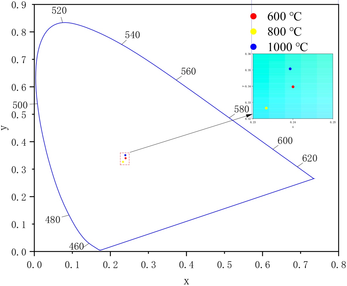 图7是通过Chromaticity Diagram对图6(b)中发射光谱数据进行色坐标计算获得的CIE-1931色度图与局部放大图。焙烧温度为600℃、800℃、1000℃对应的色坐标依次为(0.24004, 0.33964)、(0.23335, 0.32651)和(0.23933, 0.35069),由图可知,焙烧温度不同,其CIE色度略有变化,为颜色相近的绿色。