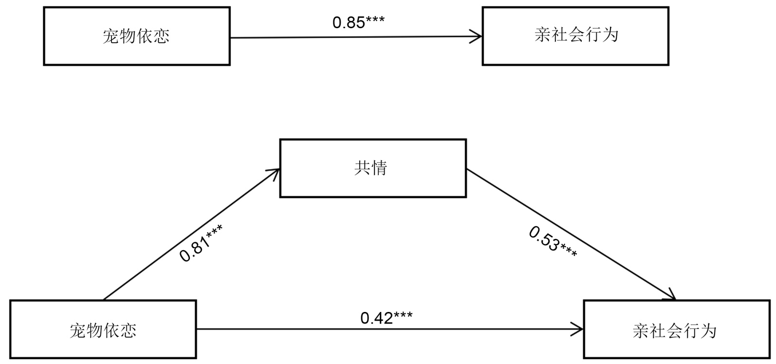 (2) 共情在大学生宠物依恋与亲社会行为之间起部分中介作用。