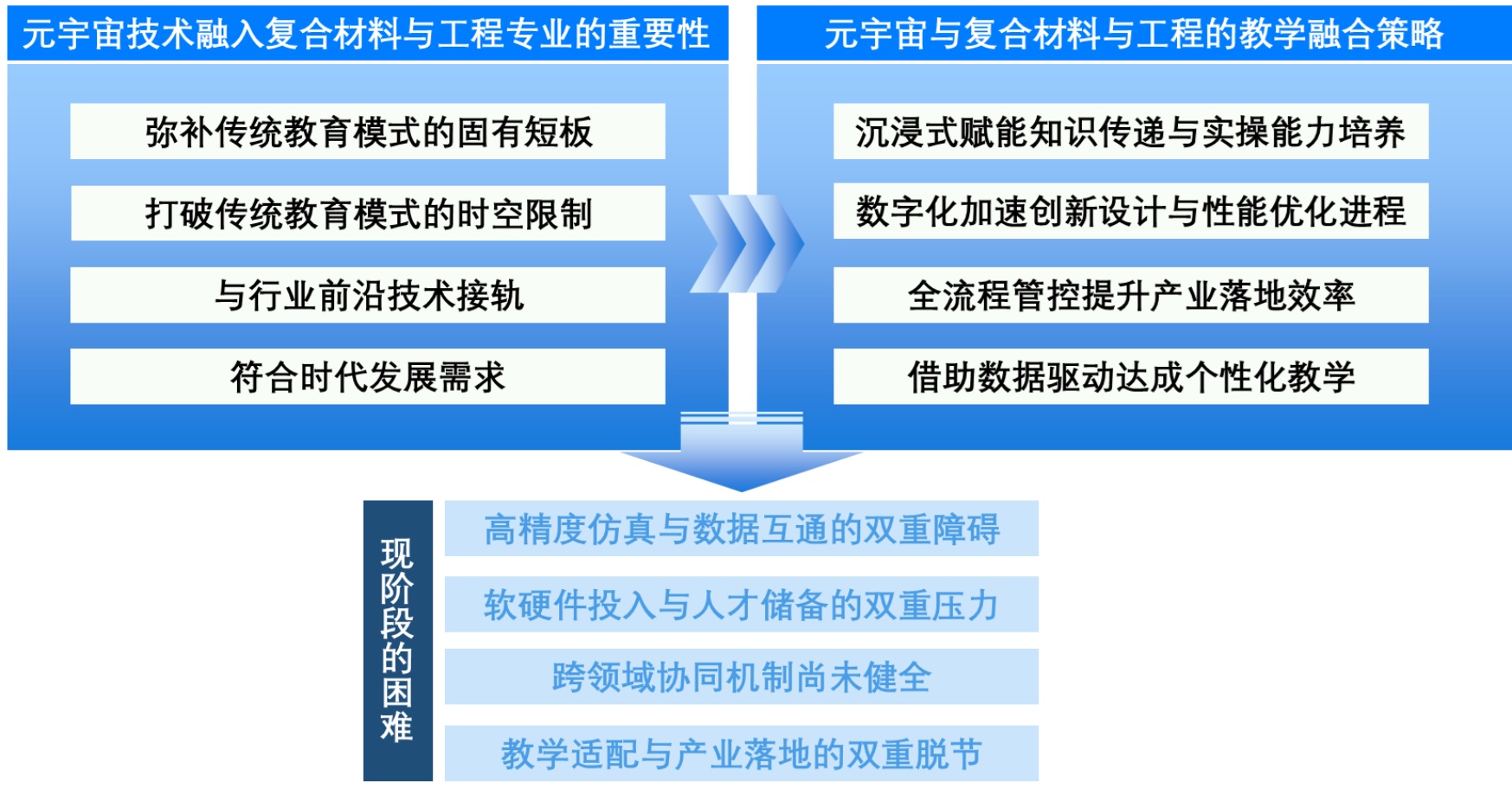 将元宇宙技术与复合材料与工程专业的融合,符合时代发展与产业升级需求。当前,数字经济与实体经济密切融合,因此,高端装备、航空航天、新能源等领域对复合材料的制造和创新提出了新的要求。在此背景下,依托于虚拟现实、增强现实、数字孪生、人工智能等技术的元宇宙,能够为复合材料的发展提供有力保障。在教学上,元宇宙突破设备、场地与安全限制,能够提升学生实践能力与工程素养。在科研上,元宇宙能实现材料微观结构模拟、性能预测、工艺优化,减少物理实验消耗,加快新型复合材料研发进程。在产业应用中,元宇宙支持设计仿真、智能制造、远程运维协同,推动产业向高端化、绿色化、智能化发展。因此,将元宇宙融入复合材料与工程专业,既是顺应科技革命的必然选择,也是提升学科竞争力、服务国家战略与高端制造发展的迫切需求。