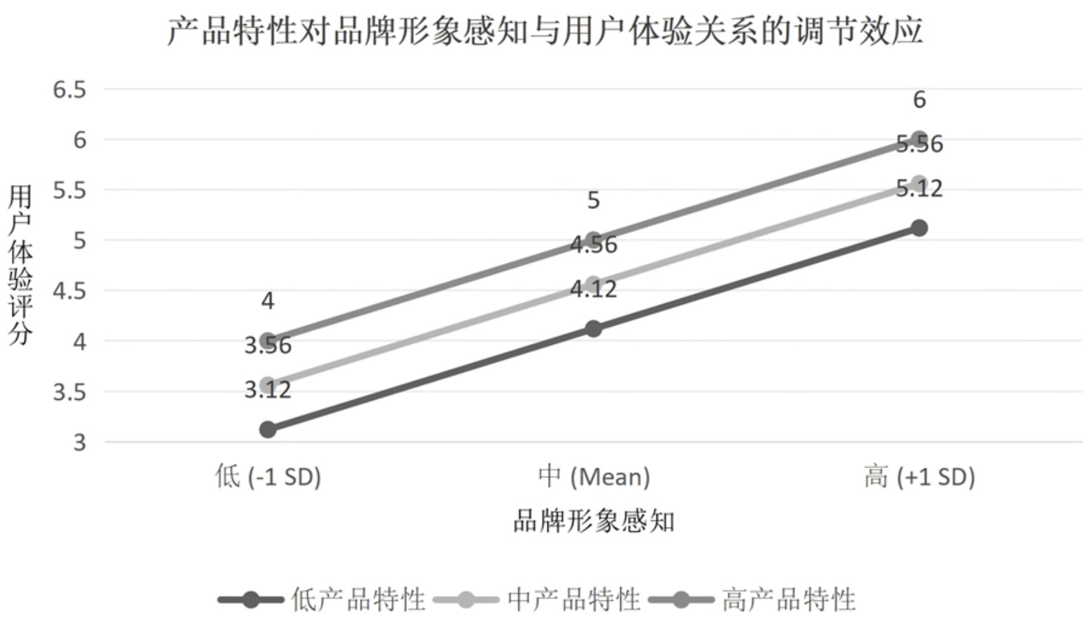 结果显示,当产品特性水平较高时(均值+1个标准差),品牌形象感知对用户体验的正向影响更强(β = 0.433, p < 0.001);当产品特性水平较低时(均值−1个标准差),品牌形象感知对用户体验的正向影响较弱(β = 0.317, p < 0.001)。这表明优秀的产品特性能够增强品牌形象感知对用户体验的促进作用,与线索利用理论关于“线索一致性”的预测相符。