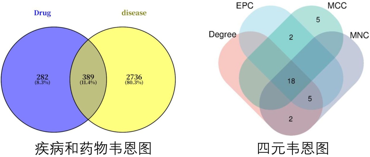 Figure 1. Wayne diagram, quaternary Wayne diagram, and PPI diagram
