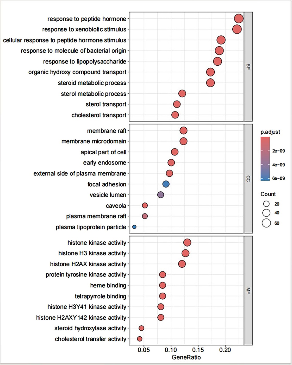 将刺五加与冠心病的交集基因导入DAVID数据库进行GO功能富集分析,设置P < 0.05,共得到bp 2871条、cc 123条、mf 307条。分别选取前10条进行可视化分析(见图2),结果显示:bp主要集中在对肽类激素的反应、对外源性刺激物的反应等方向上;cc主要集中在膜筏、膜微结构域等方向上;mf主要集中在组蛋白激酶活性、组蛋白H3激酶活性等方向上。