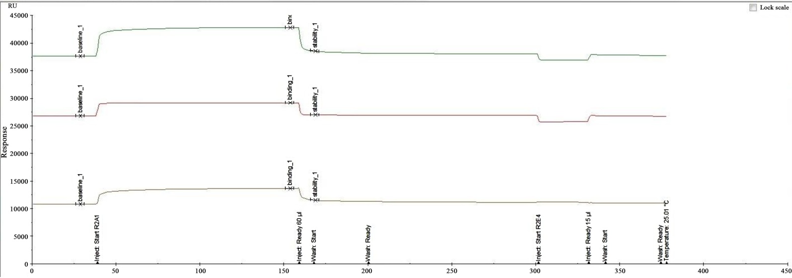 图中红线为1通道结合曲线;绿线为2通道结合曲线;棕线为1、2通道结合曲线。