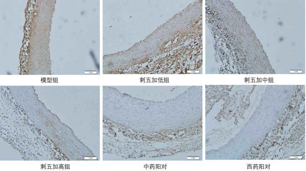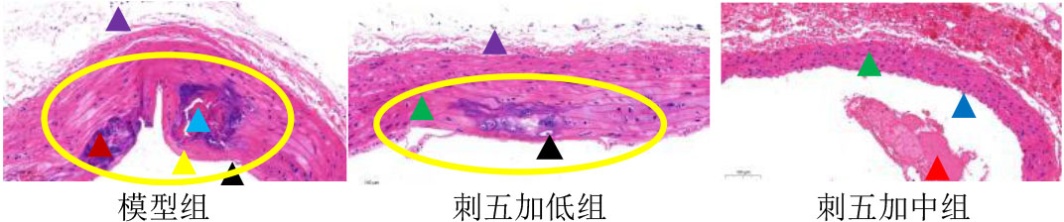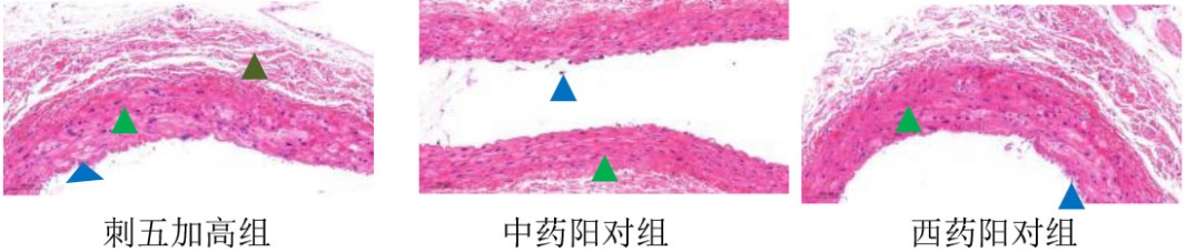 将主动脉进行HE染色与空白组相比,可见模型组的主动脉大面积内皮细胞脱落、部分区域内皮完全消失(黑色箭头),可见粥样斑块(黄色圆圈)形成,斑块内可见坏死核心(蓝色箭头),斑块表面纤维帽变薄(黄色箭头),中膜可见钙化灶(深红色箭头);外膜弹性纤维断裂、排列紊乱,可见少许炎性细胞浸润(紫色箭头)。与模型组相比,各组斑块减少至消失,胶原增生逐渐减少至无增生,其中刺五加高剂量组治疗效果较好,内膜轻度增厚(深蓝箭头),内皮细胞基本完整,无明显肿胀或空泡化;中膜平滑肌细胞(绿色箭头)排列不整齐,厚度接近正常;外膜厚度接近正常,间质轻度水肿,结缔组织排列疏松(深绿色箭头),可见通脉刺五加治疗效果好(见图5)。