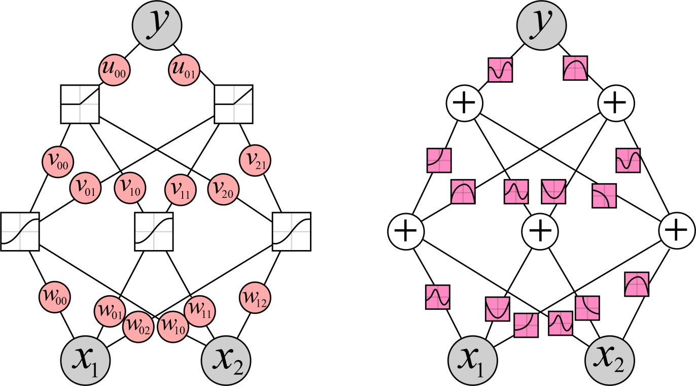 图2. KAN单元结构(左)与MLP单元结构(右)示意图