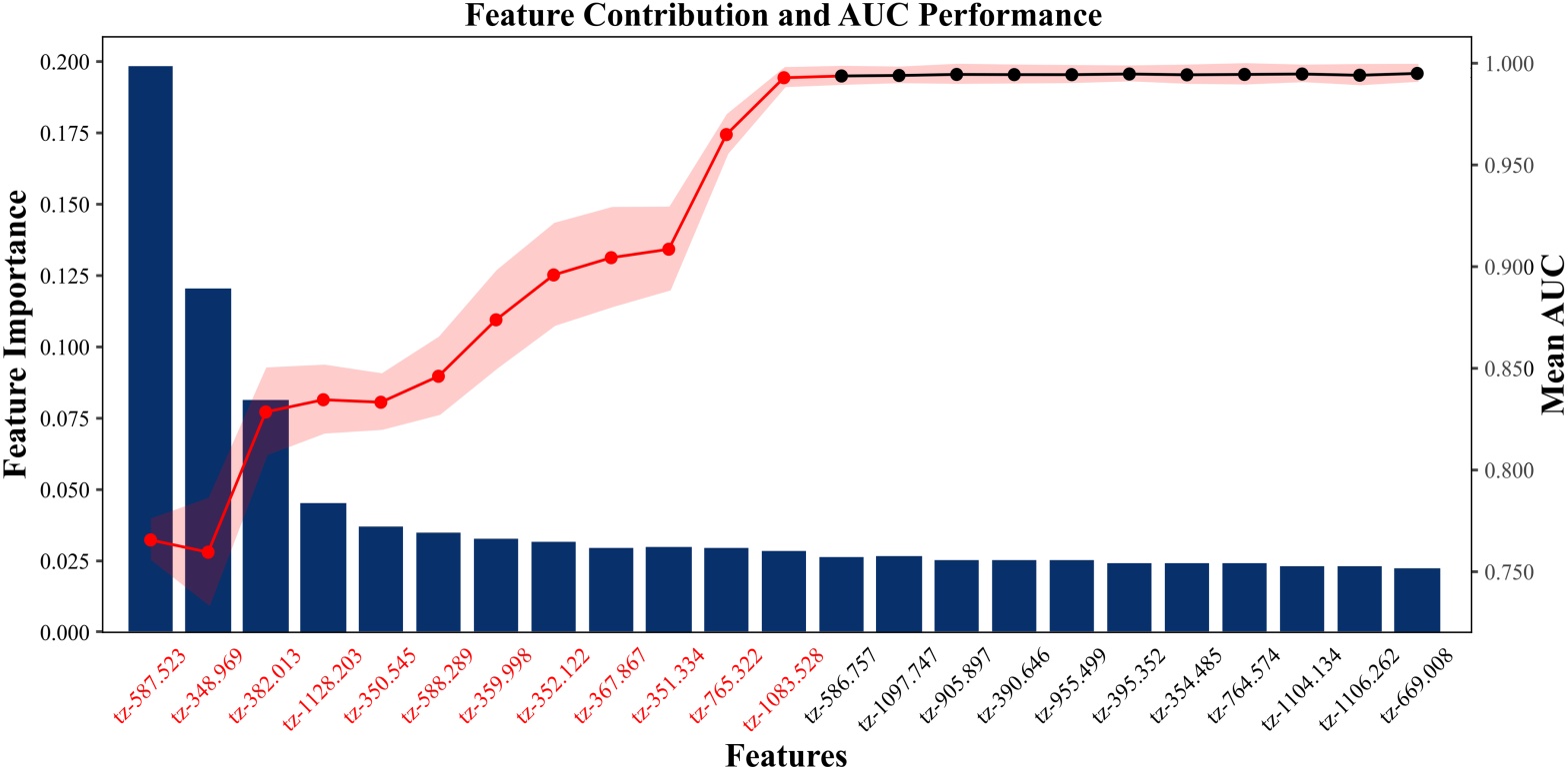 图4. 特征重要性柱状图叠加AUC变化趋势折线图