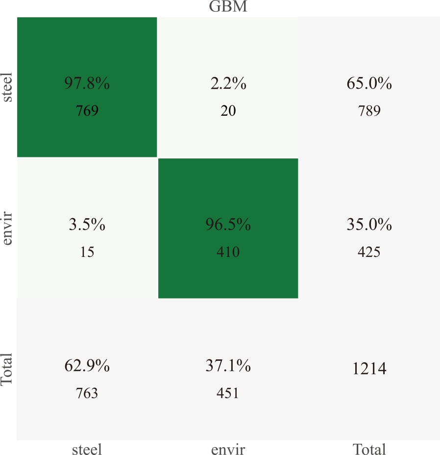 最终模型中,GBM (梯度提升机)通过自动调参获得如下最优参数:学习率为0.05,最大深度为5,子样本比例为0.8,最小子分裂样本数为10,叶节点最小样本数5。这组参数在测试集(n = 1214)上表现最佳,其对应的混淆矩阵如图5所示,并在主要评价指标中取得了最优结果见表1。
