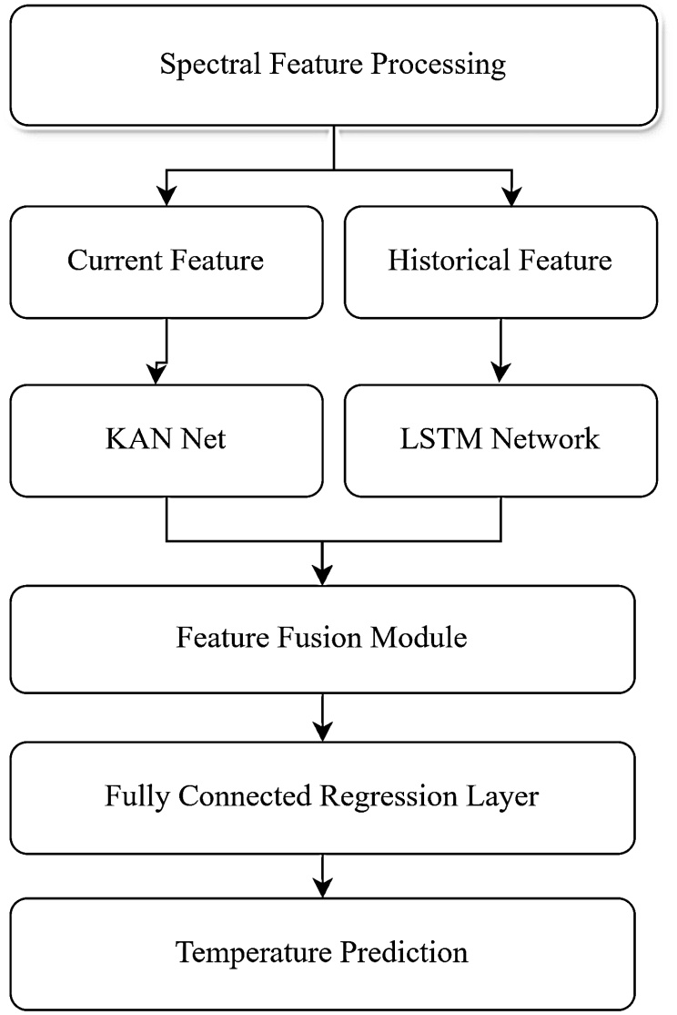 为了提升温度反演的鲁棒性与准确性,本文通过一种融合KAN神经网络与LSTM神经网络的模型充分挖掘钢水辐射光谱的时序演化特征与局部关键信息,实现对钢水真实温度的高精度建模与有效反演。