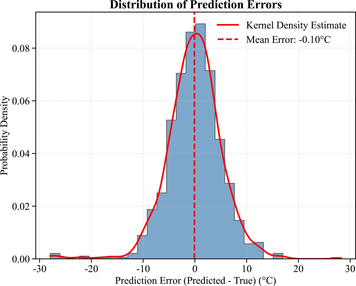 训练过程中,模型在第103个epoch达到最佳性能后触发早停机制,有效防止了过拟合。最终训练损失为0.0085,验证损失为0.0121 (如图7),平均绝对误差(MAE)为4.9443℃,均方根误差(RMSE)为6.3798℃,决定系数(R2)达到0.9783。当前学习率调整至6.9 × 10−5,大误差比例(Δ > 15℃)为1.08%,表明模型在大部分样本上预测表现稳定且精度较高。误差大小分布与预测结果如图8、图9所示。