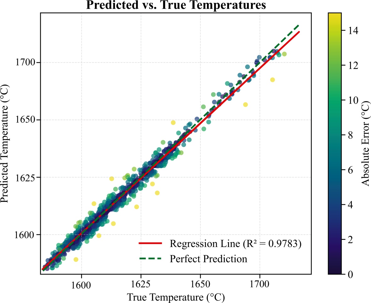 本文针对转炉出钢测温难题,结合多光谱测温的理论基础,提出了一种远程自动钢水测温系统。该系统采用梯度提升分类器(准确率为97.1%)进行阶段一识别,并结合长短时记忆网络(LSTM)与KAN神经网络的温度预测模型(平均绝对误差MAE = 4.9443℃,温度误差超过15℃的比例仅为1.08%)实现阶段二精准预测,形成双阶段架构,能够有效提升钢水温度测量精度。研究实现了对转炉炼钢出钢过程中钢水温度的非接触精准测量,有望提高炼钢工业整体智能水平合和减少吨钢成本。