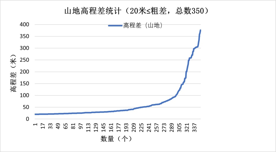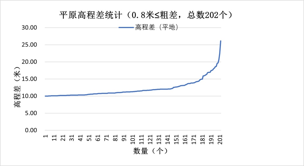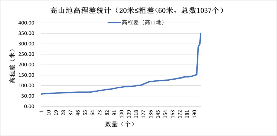 平原高程差统计见图1,丘陵高程差统计见图2,山地高程差统计见图3,高山地高程差统计见图4。