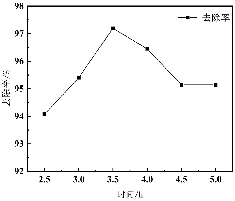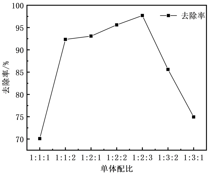 (1) 为探究最佳反应条件,以25 mg/L苋菜红溶液的去除率为指标,对不同反应时间、温度及单体配比下合成的絮凝剂进行性能测试。分别取50 mL上述染料溶液,加入0.05 g不同合成条件的絮凝剂,搅拌15分钟后静置72小时,离心后取上清液,使用UV-Vis分光光度计测定吸光度并计算染料去除率,以此确定最佳合成条件。