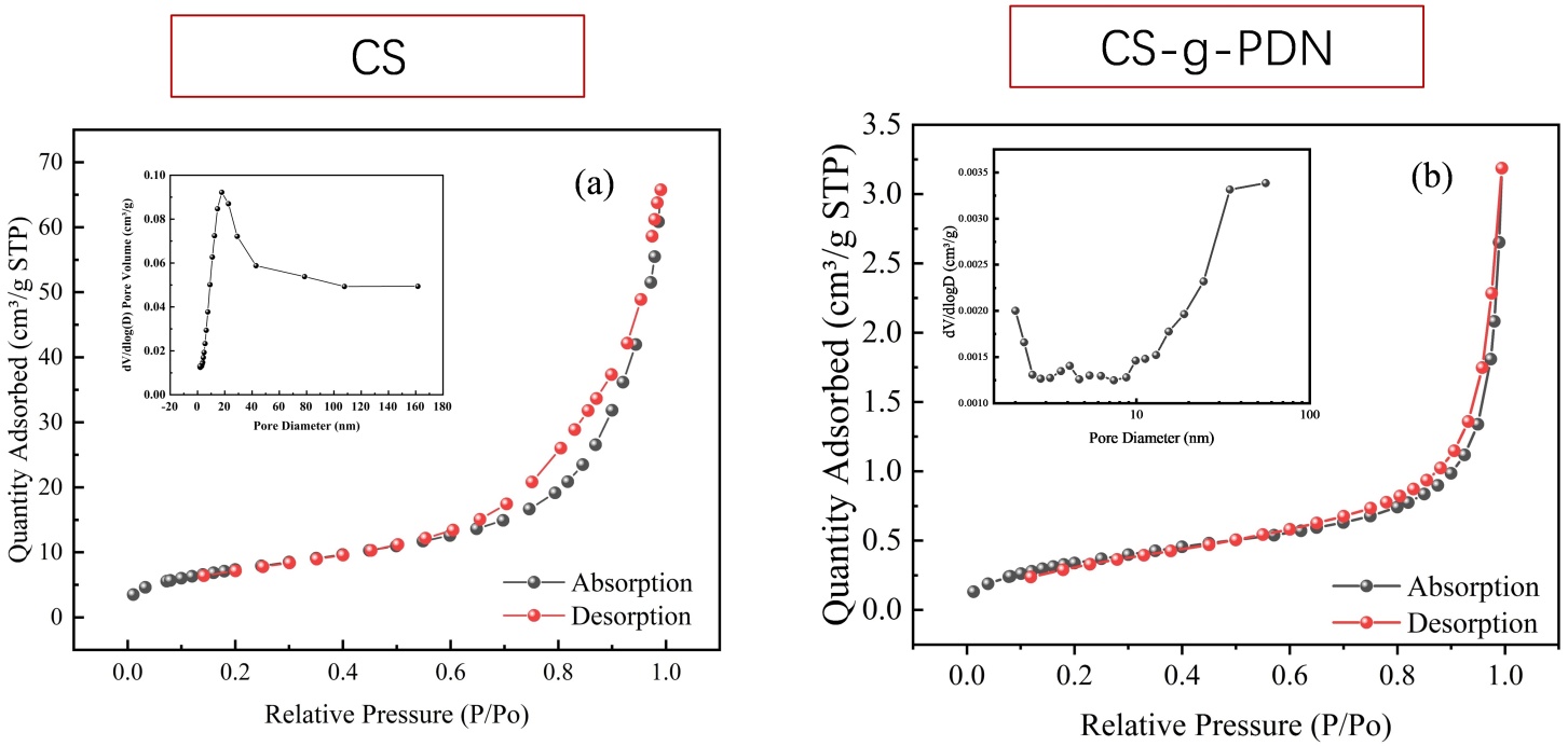 图6(a)和图6(b)分别为CS和CS-g-PDN的N2吸附–脱附等温线,均为IV型等温线(IUPAC分类),表明存在典型的介孔(中孔)材料[10]。
