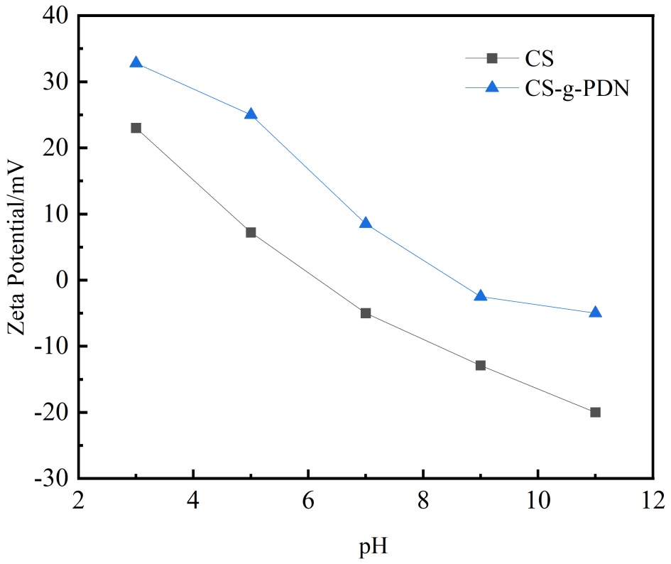 图7. CS和CS-g-PDN的Zeta电位随pH变化