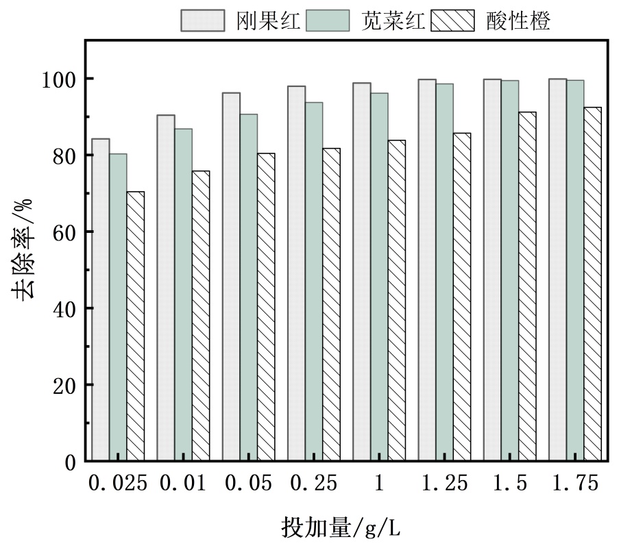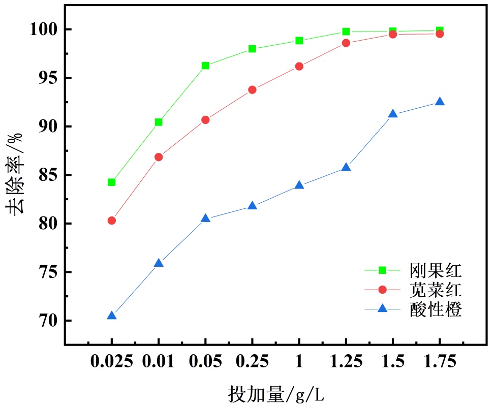 (2) 探究絮凝剂添加量对染料去除率的影响:分别配制浓度为0.25 g/L的刚果红、苋菜红和酸性橙G溶液(各0.25 g染料溶于1 L去离子水)。使用1 mol/L HCl与1 mol/L NaOH溶液调节各染料溶液pH至7。