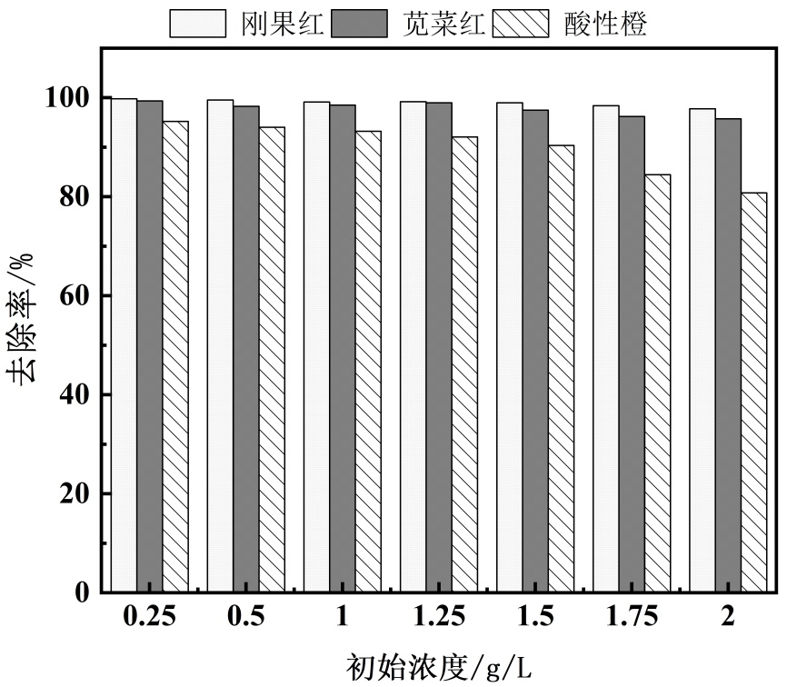 (4) 探究染料初始浓度对絮凝剂去除率的影响:分别称取0.2 g、0.33 g、0.5 g、1.25 g、1.5 g、2 g的刚果红,苋菜红和酸性橙G分别溶于1 L的去离子水中,制备0.2 g/L、0.33 g/L、0.5 g/L、1.25g /L、1.5 g/L、2g /L的三种染料溶液,使用配置好的浓溶液调节预制浓度的刚果红、苋菜红和酸性橙G溶液pH至6。