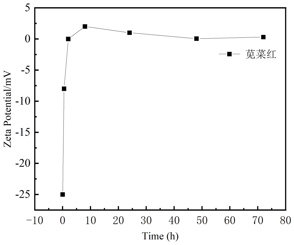 在最佳实验条件下CS-g-PDA对苋菜红絮凝过程中上清液的Zeta电位变化图像如图12所示,该图揭示了CS‑g‑PDN絮凝苋菜红的动态过程:0~2 h (快速电中和):阳离子絮凝剂迅速吸附染料颗粒,通过电荷中和使体系脱稳,形成微絮体;2~24 h (吸附架桥为主):电中和基本完成,转为依靠三维网状结构进行桥联与网捕,形成密实矾花并开始沉降;24~72 h (沉降平衡):大规模沉降结束,上清液澄清,Zeta电位趋于稳定,由残留微量絮凝剂或细小絮体碎片贡献。