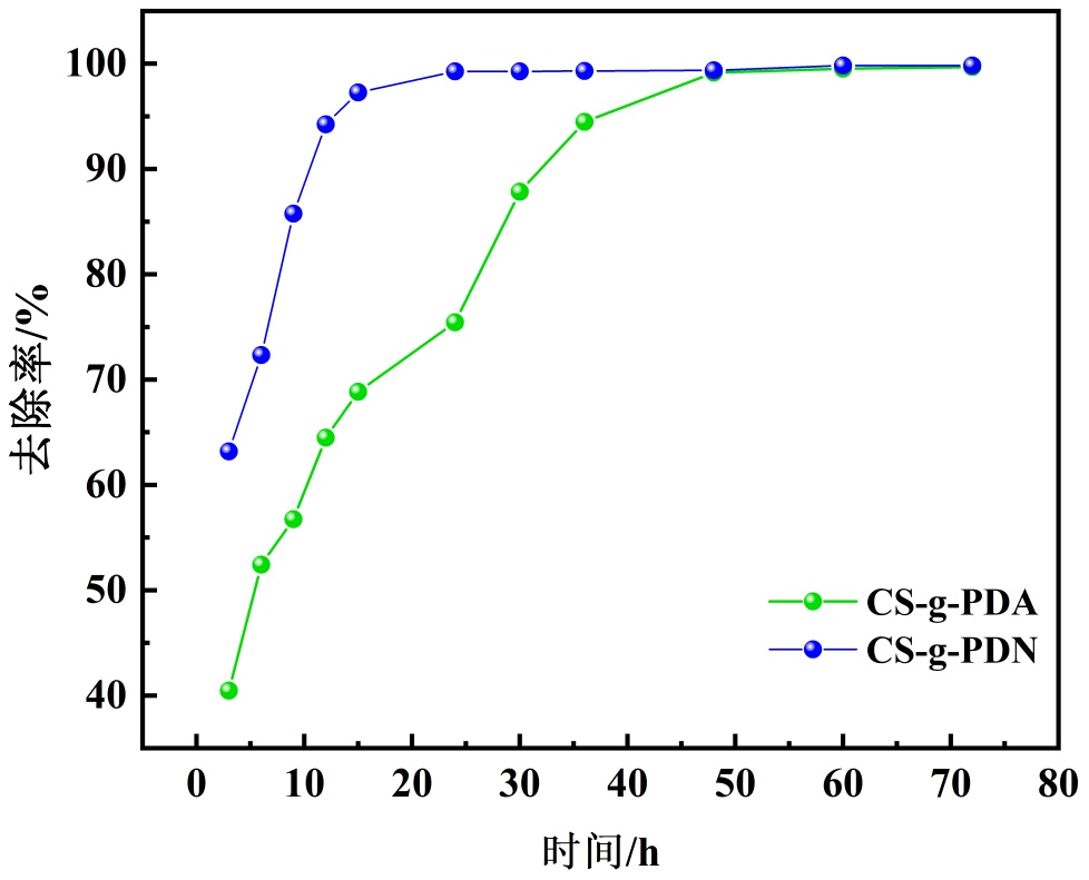使用0.5 g/L的苋菜红溶液,设置pH为6,探究时间对于絮凝剂CS-g-PDN絮凝性能的影响,同时对照相同添加量的CS-g-PDN和CS-g-PDA在相同溶液中在不同絮凝时间下的去除率,结果如图14所示。絮凝时间对去除率的影响如图14所示:CS‑g‑PDN在3 h时去除率为40.5%,随反应时间延长逐渐升高,至24 h达最大值99.27%;CS‑g‑PDA在3 h时去除率为63%,36 h时为94%,48 h才达到99.1%。两者均随时间延长而效率提升,源于更充分的电荷中和、架桥及网捕作用。CS‑g‑PDN絮凝速率更快,是由于其NAM单体中的酰胺基(–CON(CH3)2)亲水性强、甲基基团提供空间位阻,促进分子链伸展[13],从而增强了桥联效率。