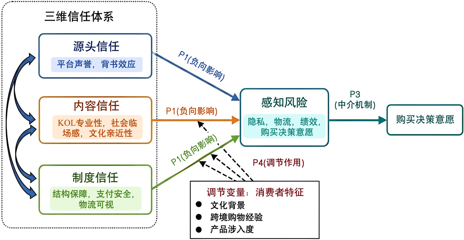 消费者个体特征的差异会显著调节信任机制对风险感知的作用力度。首先,文化背景与文化距离是关键的调节变量。跨境交易主体间的文化距离会调节消费者对认知风险的感知程度([9], p. 1)。对于具有多元文化背景的消费者,其对跨文化符号的理解力更强,因而更能接受基于品牌形象塑造的“内容信任”([12], p. 24);而单一文化背景的消费者可能更依赖标准化的制度信任来规避文化冲突。其次,产品涉入度与过往经验也起调节作用。高涉入度或拥有丰富跨境购物经验的消费者,往往具备更强的信息辨别能力,能够更深入地解读营销中的善因认同与品牌价值([10], p. 28),因而更看重内容的专业性与真实性;相反,新手消费者由于缺乏经验,更倾向于依赖源头平台的声誉背书与显性的制度保障来简化决策过程。