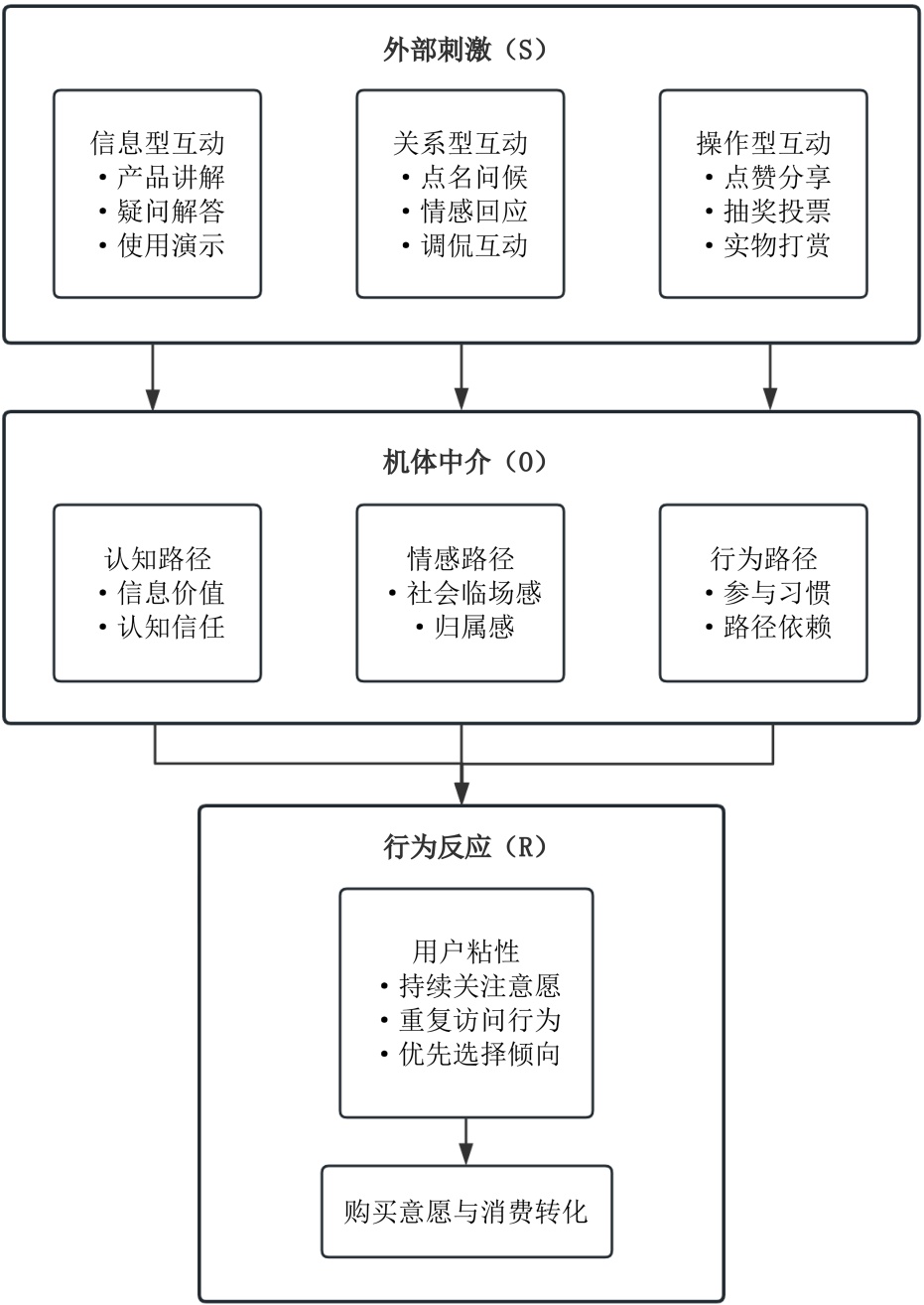 因此,在电商直播场景中,互动性构成核心的环境刺激(S)。用户感知到的互动质量会唤起内在的认知与情感状态(O),即感知价值、信任感、社会临场感、心流体验等。诸种内在状态明确表现为用户粘性(R)——持续观看、重复购买、主动推荐等行为。具体而言,用户在互动中获得有用信息、被充分重视、获得参与乐趣时,对直播间的价值评价会提高,更倾向于持续关注。