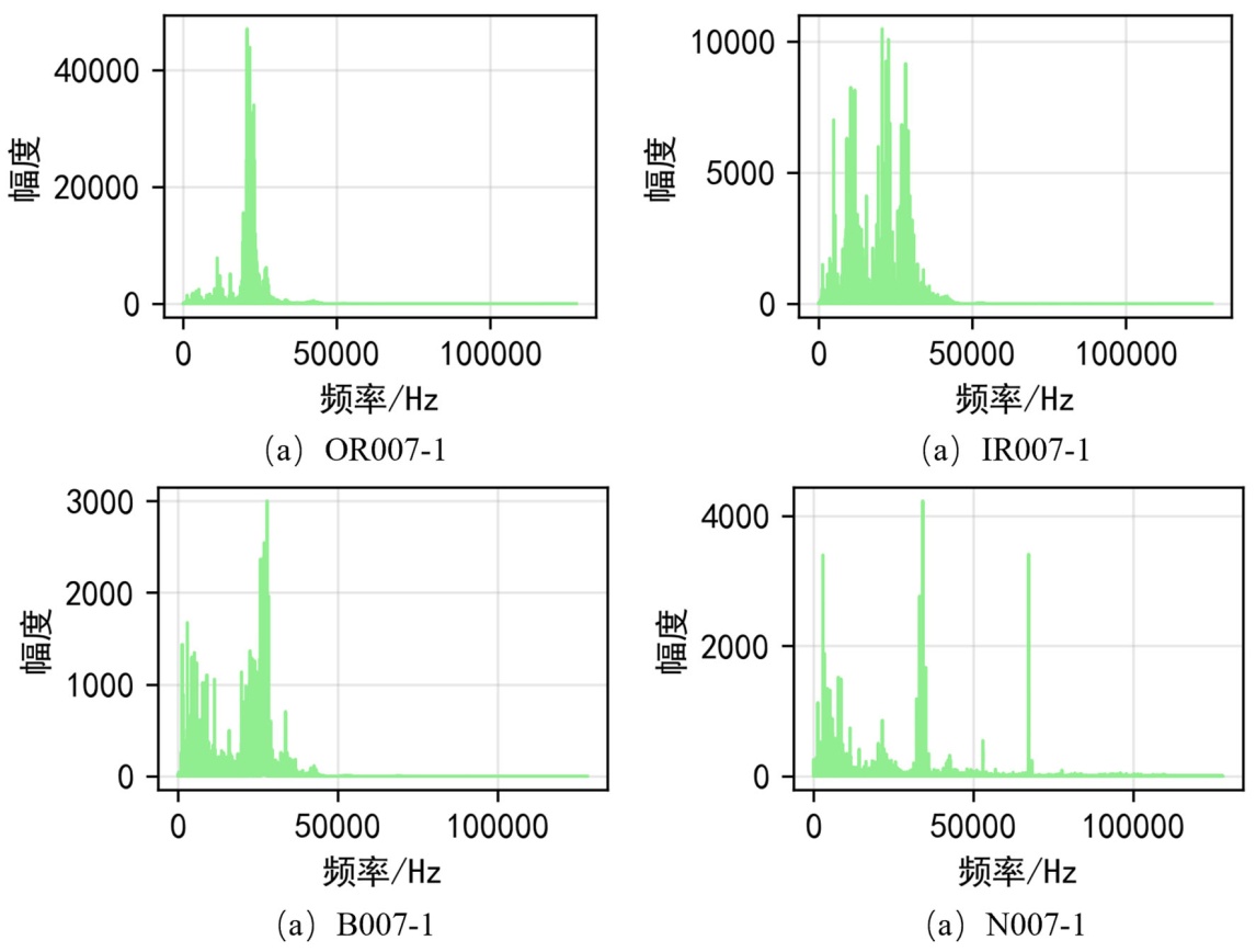 对四类故障的去噪窗口样本做快速傅里叶变换(FFT),计算理论特征频率,验证频域峰值显著性。频域可视化结果(图7)显示,故障样本均在理论特征频率附近出现尖锐峰值,而正常样本无显著峰值。外圈故障在BPFO频率处出现明显峰值,内圈故障在BPFI频率处出现峰值并伴随转频调制边带,滚动体故障在BSF频率处出现峰值,验证了特征提取的有效性。