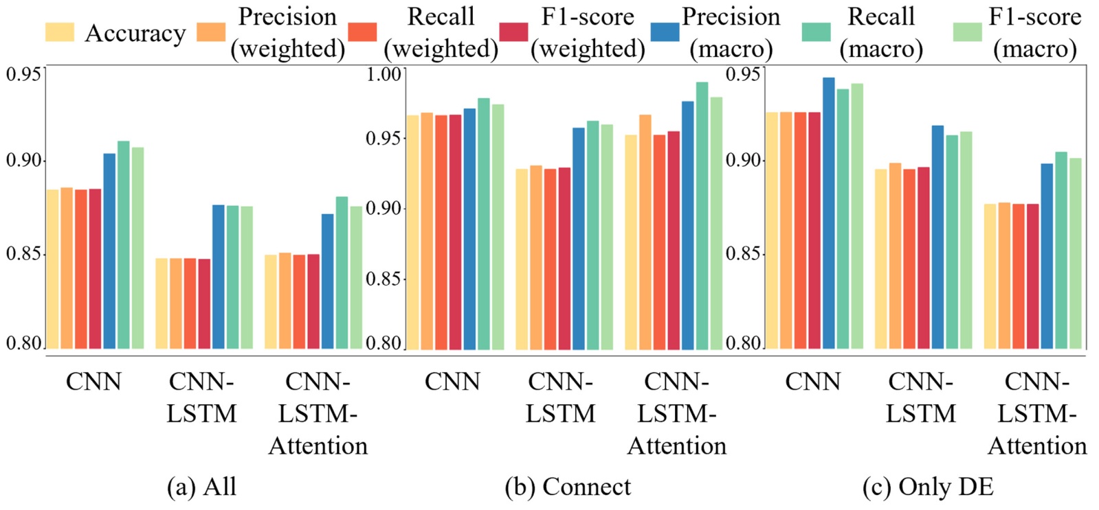 通过Accuracy、Precision (weighted/macro)、Recall (weighted/macro)、F1-score (weighted/macro)评估指标对三种模型在三种传感器数据场景下的性能进行评价。性能对比结果如图9所示。实验结果表明:纯CNN模型在所有场景下均优于“CNN + LSTM”与“Attention增强模型”;Connect场景(DE + FE数据融合)是最优数据方案——剔除BA端冗余信号后,模型聚焦于故障特征显著的DE与FE数据,信息密度提升,使得CNN模型准确率达96.61%,为所有场景最高。