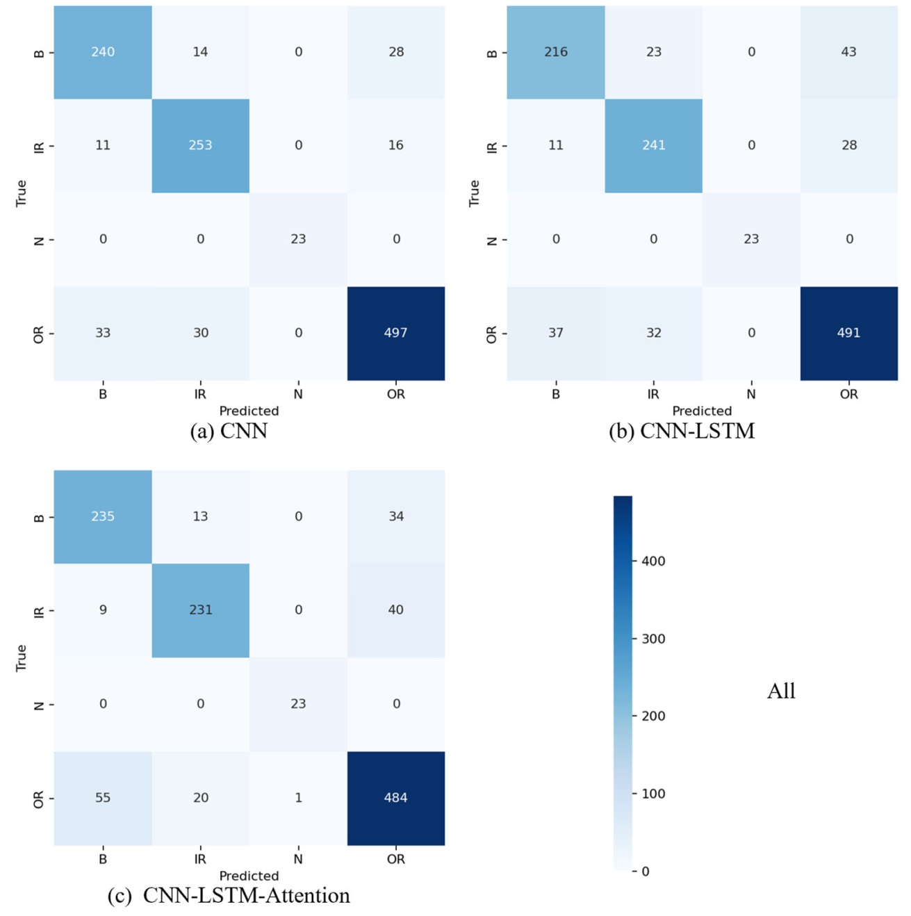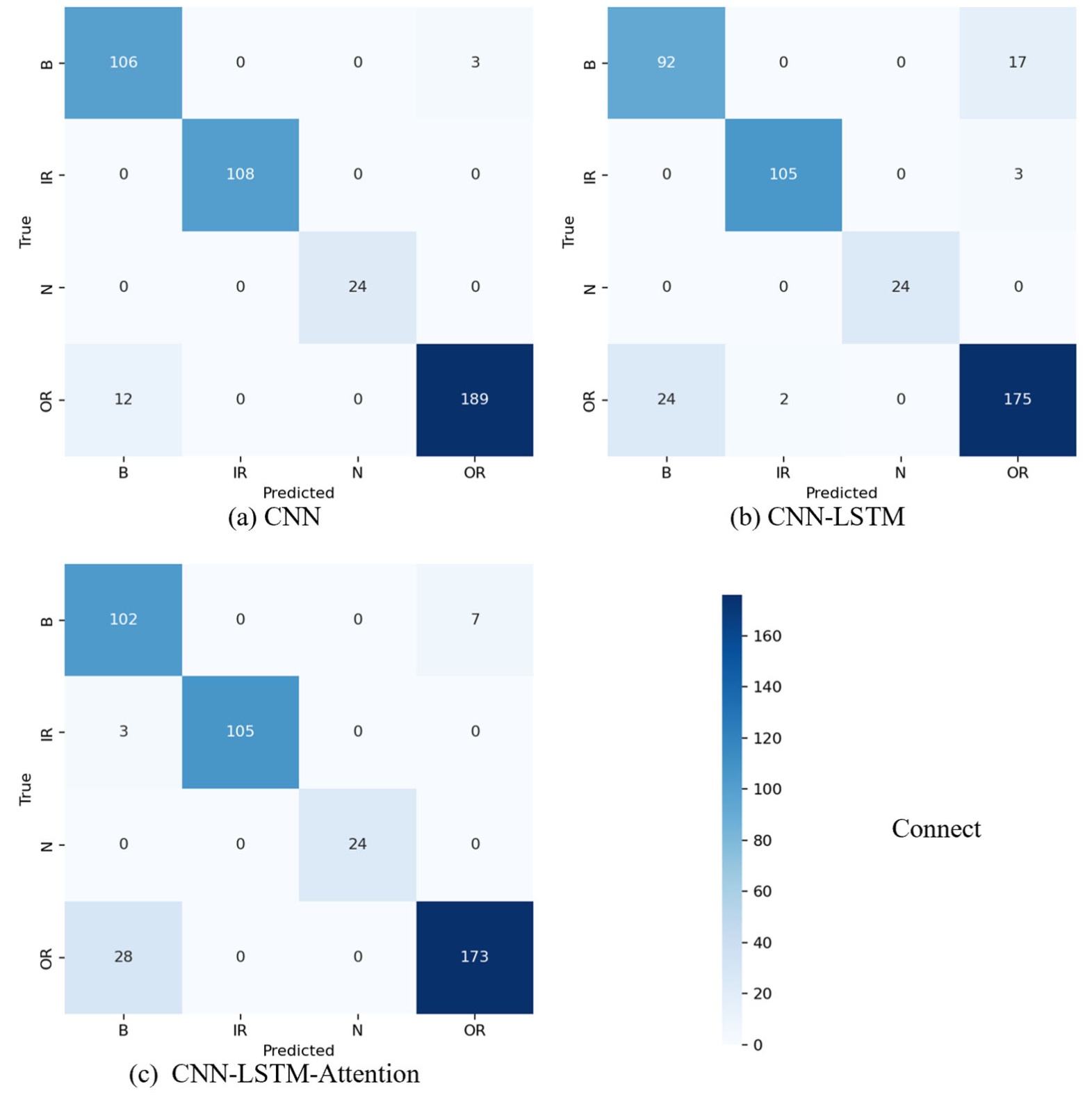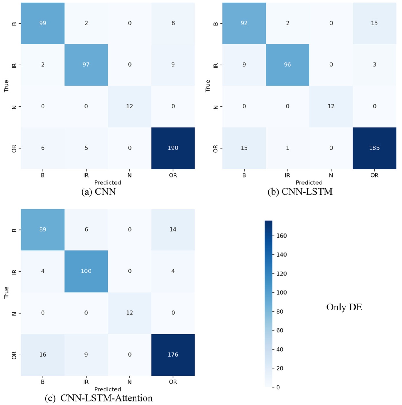 Connect场景下的CNN模型表现最优,准确率达96.61%,加权F1-score达0.965;All场景因包含BA端冗余数据,模型性能略有下降;Only DE场景因数据维度单一,滚动体故障召回率仅91%。CNN模型在所有场景下均优于CNN-LSTM与CNN-LSTM-Attention模型,主要原因:轴承故障特征以局部空间组合模式(如“时域峰度 + 频域BPFO峰值”)为主,时序依赖关系较弱,过度叠加LSTM与注意力模块易导致模型过拟合,增加计算复杂度。Connect场景下CNN模型的混淆矩阵显示:内圈故障(IR)召回率100% (108/108),外圈故障(OR)召回率94.1% (189/201),滚动体故障(B)召回率80% (106/109),正常状态(N)召回率100% (23/23)。滚动体故障召回率相对较低,主要因滚动体故障特征受公转与自旋调制,特征区分度略低于内圈、外圈故障,属机理层面的合理误差。