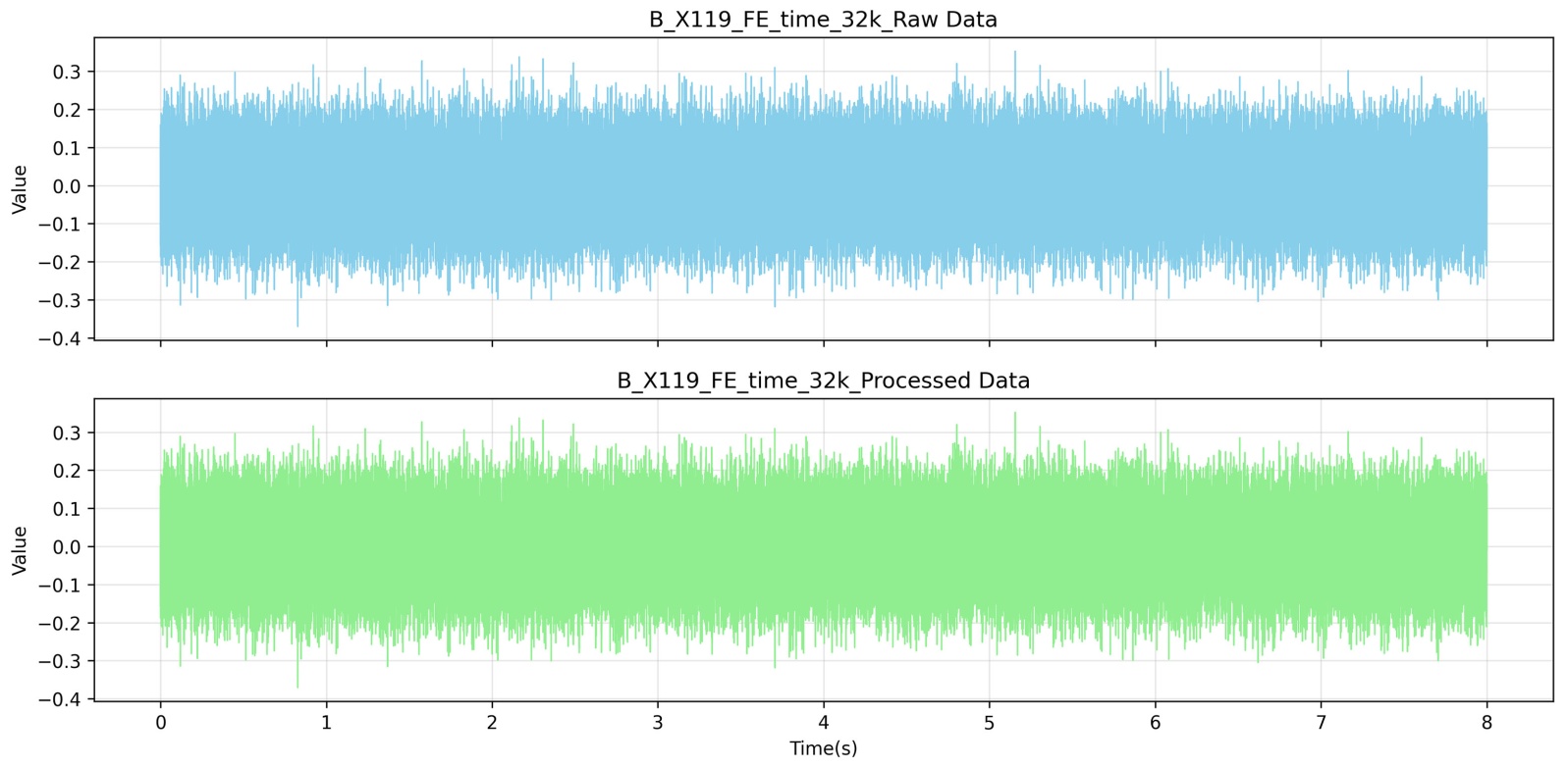 源域数据来源于轴承试验台架振动数据,包含驱动端(DE)、风扇端(FE)和基座(BA)三个位置的加速度信号[8]。数据采样频率包括12 kHz和48 kHz两种,目标域数据采样频率为32 kHz [11]。为确保数据一致性,对所有信号进行重采样处理,统一至32 kHz采样频率(图1)。此外,使用scipy.signal库对源数据做抗混叠滤波,并统一至32 kHz采样频率,采取去均值去趋势处理(图2)后做下一步分析。