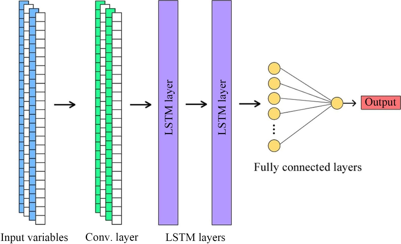 图4. CNN-LSTM模型,具有一个卷积层、两个LSTM层和两个全连接层