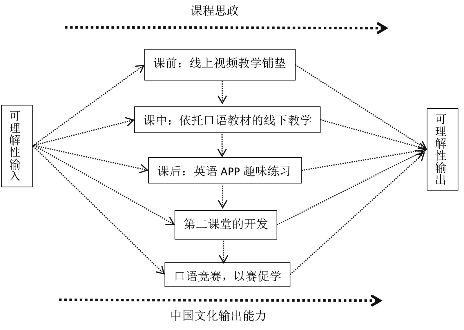 综合考量民办教育背景和模块化教学的特点,以输入/输出假设理论为主线,以中国文化输出能力和课程思政为课程的精髓,本研究重点落实到大学英语1中的口语模块教学实践,粗略构建了大学英语口语模块化教学的理论框架(如图1所示)。在图1中,口语模块课程五个环节,分别为课前、课中、课后、第二课堂和口语竞赛,均遵循可理解性输入和可理解性输出原则,促进学生语言技能的增长。在改善学生语言知识和技能的同时,隐性地塑造学生价值观和涵养其中国文化输出能力,综合提高他们的学科素养。图1全部使用虚线是因为学生语言知识、交流技能和学科素养的交互转化路径是沿波浪线缓慢前进的。各个教学环节的作用也并非单向发生,有时是多重因素交相发生。比如,课中这个最重要的环节,科任教师必须关注来自其他环节的反馈,传达出正确的学习指令,为求得最佳实施效果做全方位战略部署等。