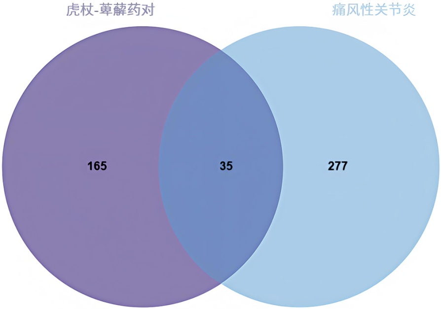图1. “虎杖–萆薢”药对活性成分靶点与痛风性关节炎相关靶点的韦恩图