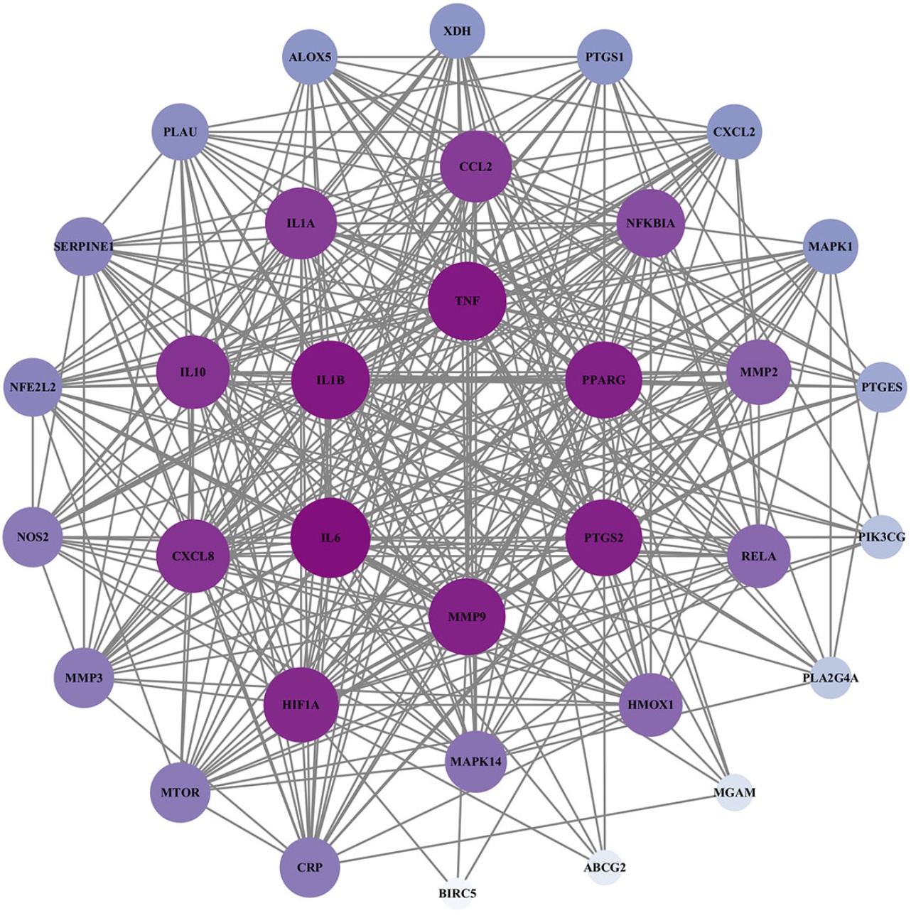 将“虎杖–萆薢”药对与痛风性关节炎的35个共有靶基因输入STRING数据库,构建蛋白质互作(PPI)网络图(见图3),该网络共包含35个节点(对应核心靶点编码蛋白)、352条边(代表蛋白与蛋白间的相互作用关系)。然后,将上述结果导入Cytoscape 3.10.3软件进行进一步分析并绘制可视化图谱(见图4),网络中节点的大小、色彩的深浅与该节点的Degree值呈正相关,排名前六的靶点有IL-6 (Degree = 32)、IL-1β (Degree = 31)、TNF (Degree = 31)、PTGS2 (Degree = 30)、MMP9 (Degree = 30)、PPARG (Degree = 30)。这些靶基因或许在“虎杖–萆薢”药对调控GA的进程中发挥着关键作用。
