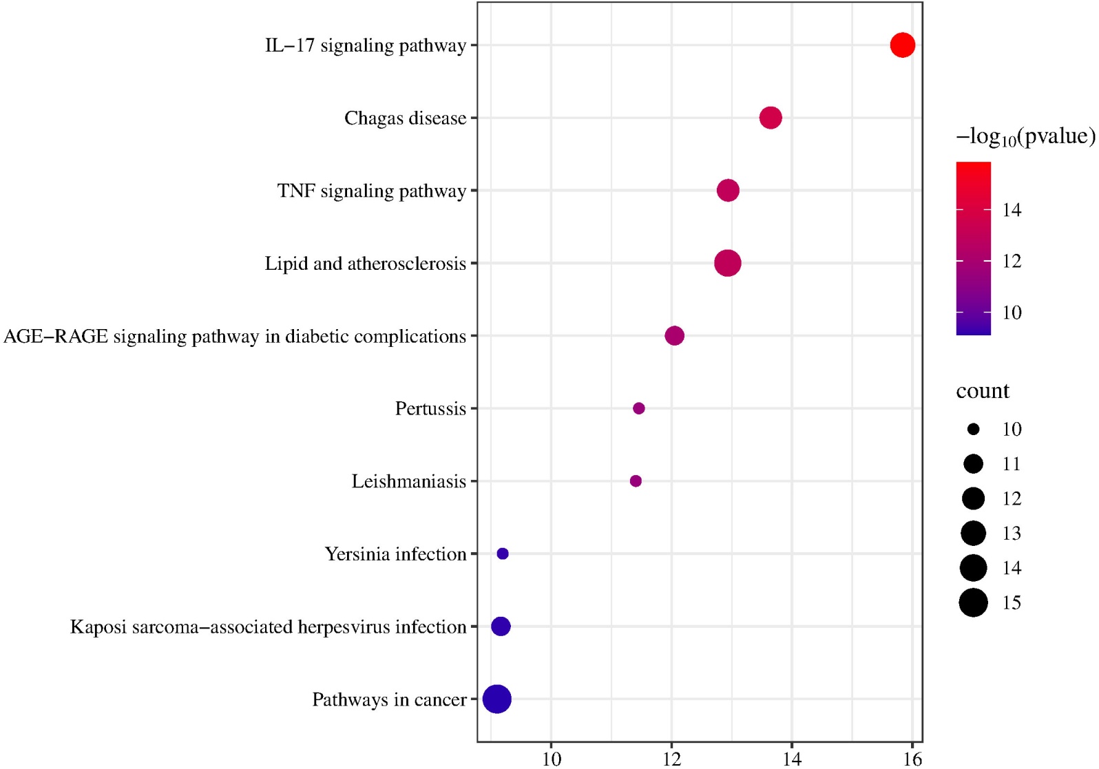 GO富集分析表明,药对靶点显著富集于急性相反应(Acute-Phase Response)、对雌二醇刺激的细胞应答(Cellular Response to Estradiol Stimulus)、血管内皮细胞迁移的正向调控(Positive Regulation of Blood Vessel Endothelial Cell Migration)、NF-κB信号转导(Regulation of Canonical NF-κB Signal Transduction)等生物过程。从细胞组分来看,靶点主要富集于内质网腔(Endoplasmic Reticulum Lumen)、细胞核(Nucleus)、膜筏(Membrane Raft)及胞外空间(Extracellular Space);从分子功能看富集最高的条目集中在肽结合(Peptide Binding)、E-Box结合(E-Box Binding)、肽酶活性(Peptidase Activity)、过氧化物酶活性(Peroxidase Activity)等,反映了靶点的分子作用机制(见图5)。KEGG通路富集分析结果显示,“虎杖–萆薢”药对治疗GA的作用可能主要通过调控IL-17信号通路(IL-17 Signaling Pathway)、TNF信号通路(TNF Signaling Pathway)、糖尿病并发症中的AGE-RAGE信号通路(AGE-RAGE Signaling Pathway in Diabetic Complications)及脂质代谢通路(Lipid and Atherosclerosis)等多条与炎症、免疫、代谢相关的关键信号通路实现(见图6)。