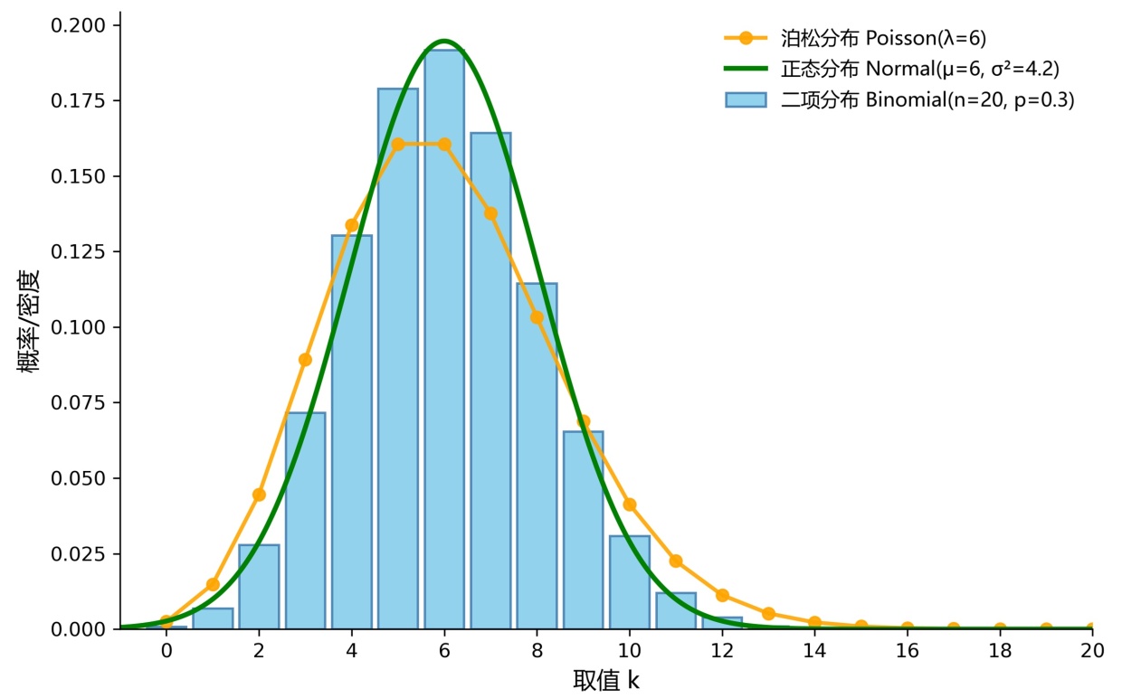 为直观比较离散型分布与连续型分布,本文选取了参数相近的一组进行可视化:二项分布取n = 20,p = 0.3 (均值np = 6,方差np (1 − p) = 4.2);泊松分布取λ = 6;正态分布取N (6, 4.2)。用Python的scipy.stats和matplotlib算出各分布的PMF/PDF,并叠加在同一坐标系(见图1)。这个设计为后续误差分析和近似判断提供了直观依据。