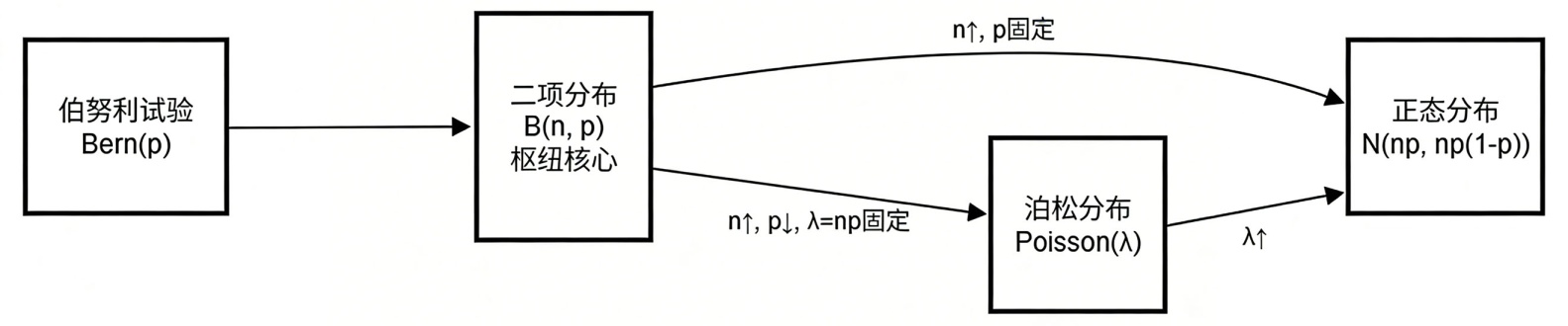 二项分布在不同参数极限下的收敛路径,是离散分布向连续分布过渡的关键,其主要结论见表1。