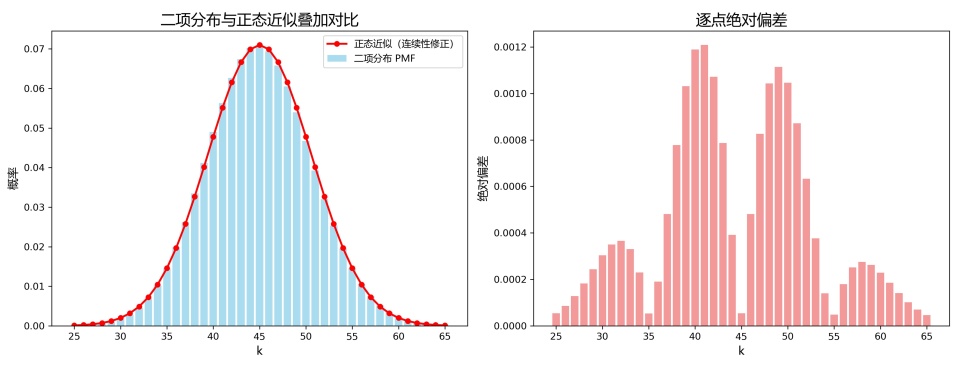 图4. 二项分布与正态近似叠加对比及偏差分析(n = 150, p = 0.3)